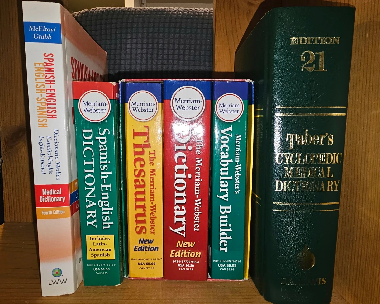 This lot includes four Merriam-Webster reference books: a Spanish-English Dictionary, a Thesaurus, a Dictionary (New Edition), and a Vocabulary Builder. Also included are a McElroy/Grabb Spanish-English, English-Spanish Medical Dictionary, Fourth Edition, and a 21st Edition Taber's Cyclopedic Medical Dictionary. They're great resources for language learners and medical professionals!