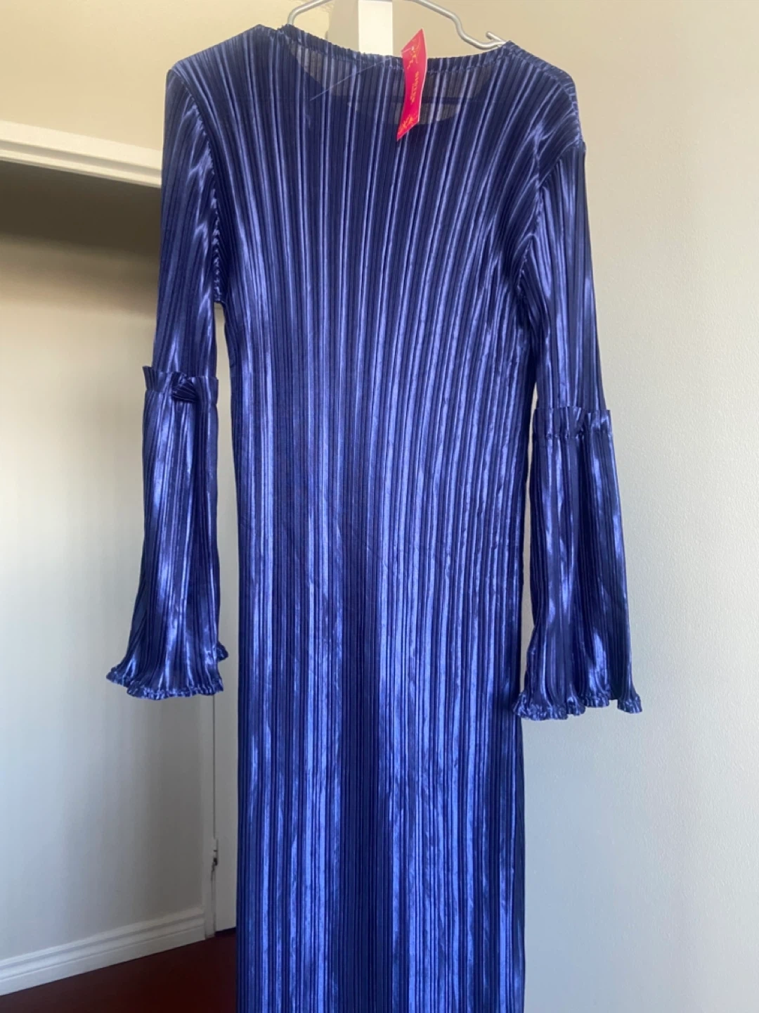 Beautiful blue pleated midi dress with a flattering, flowy silhouette. The lightweight fabric drapes elegantly and creates a sophisticated look. Features long sleeves with delicate flared cuffs for a feminine touch.