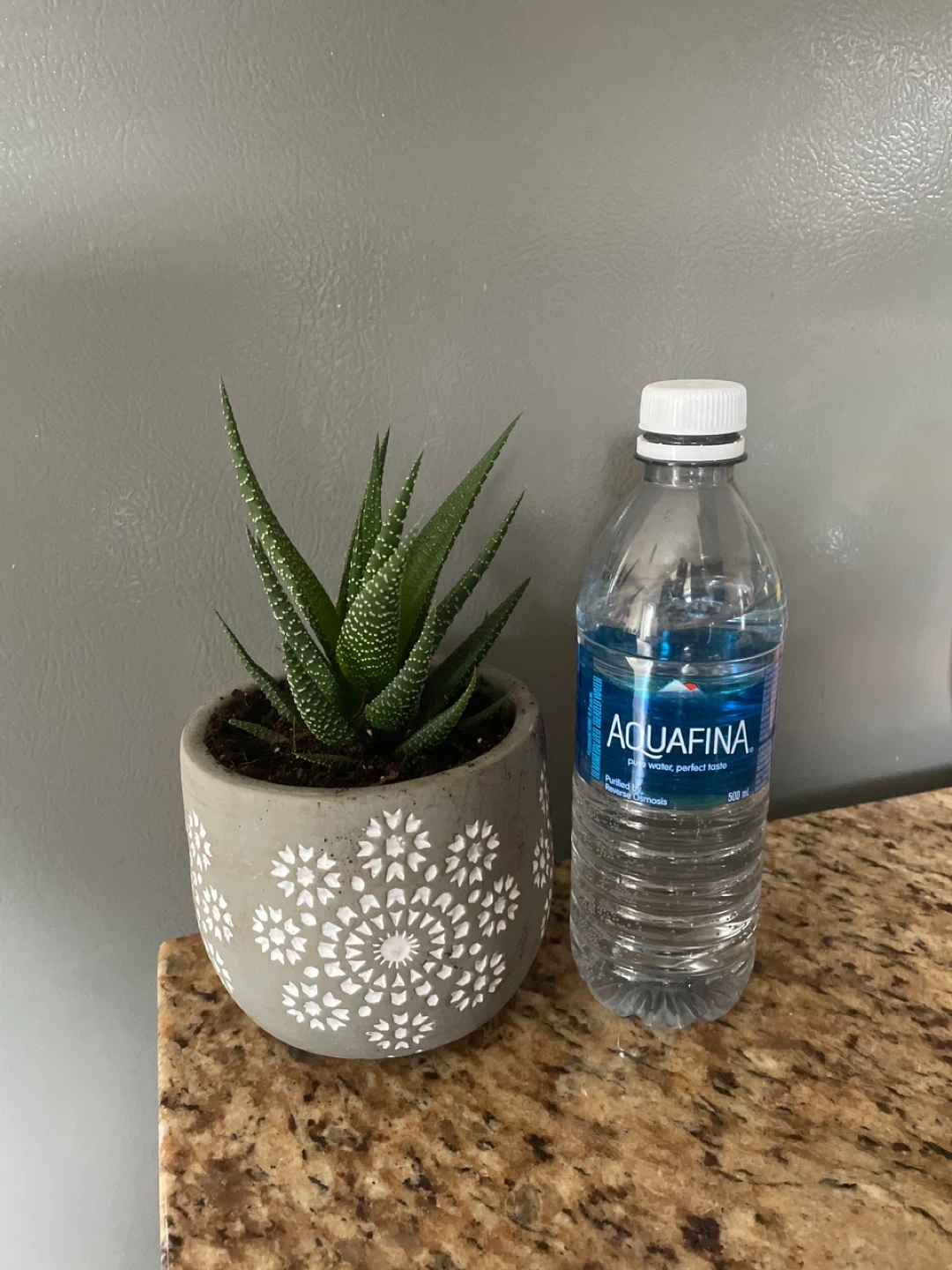 Healthy green succulent plant in a grey concrete pot with white decorative pattern. The pot measures approximately 5 inches tall. It's a lovely addition to any desk or shelf.