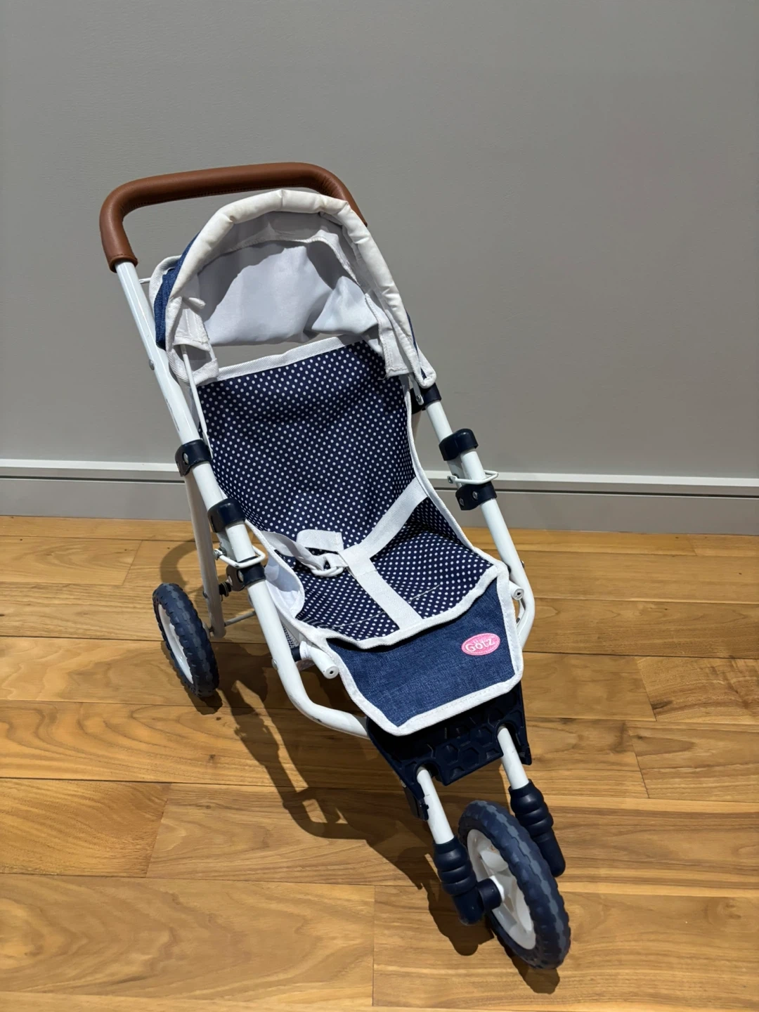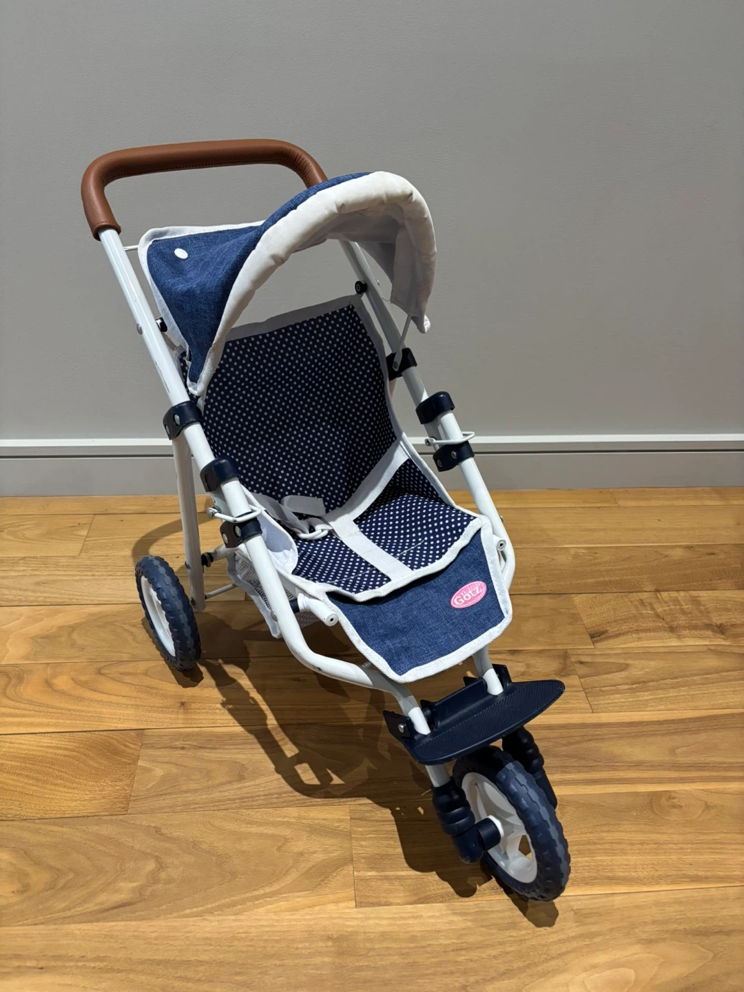 Cute and sturdy Götz doll stroller featuring a stylish blue polka dot and denim design.