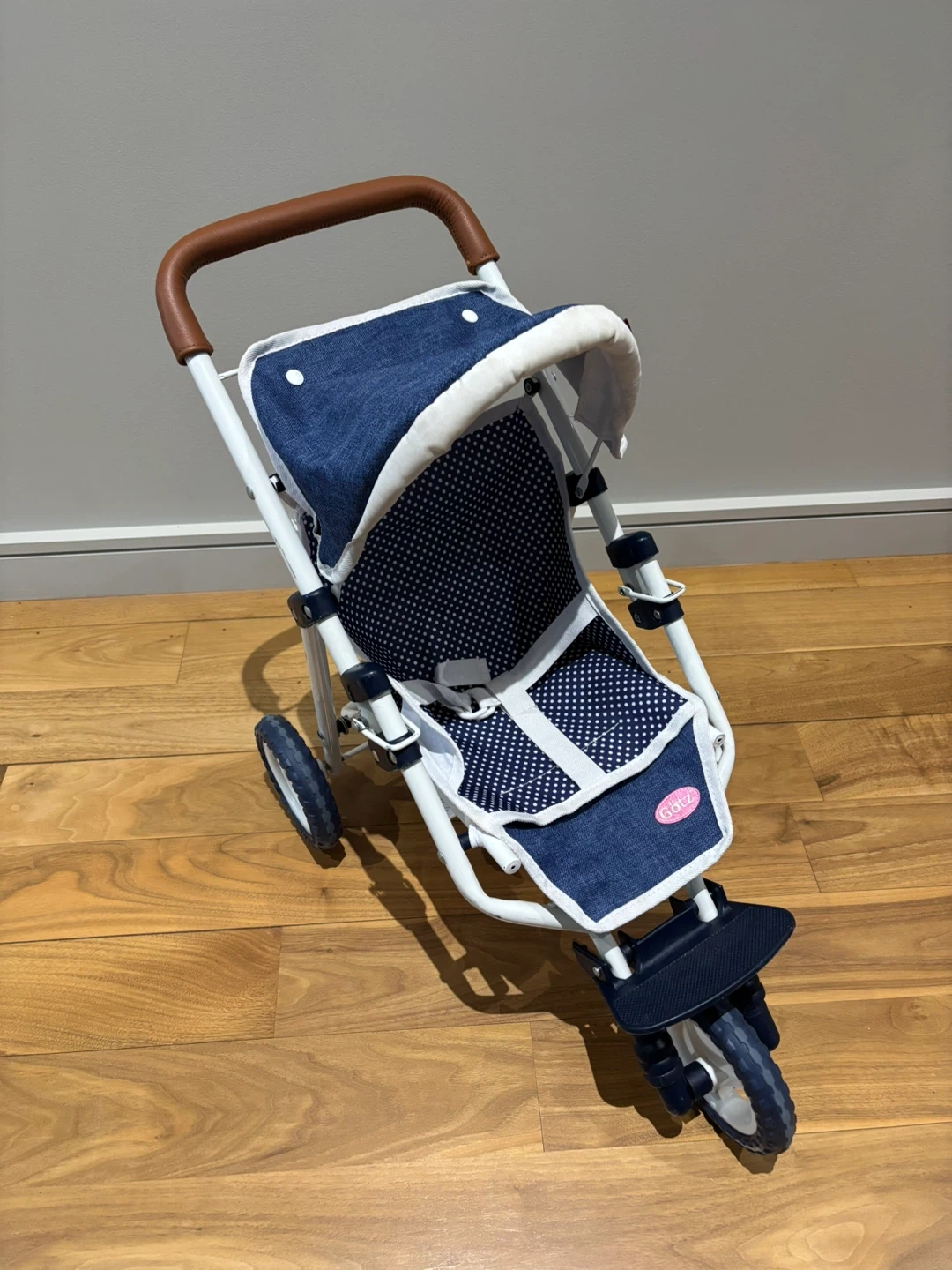 Cute and sturdy Götz doll stroller featuring a stylish blue polka dot and denim design.