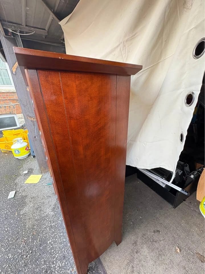 Has a rich cherry-like finish. Modern design with silver ring pulls. Drawers are clean, spacious and open and close smoothly.