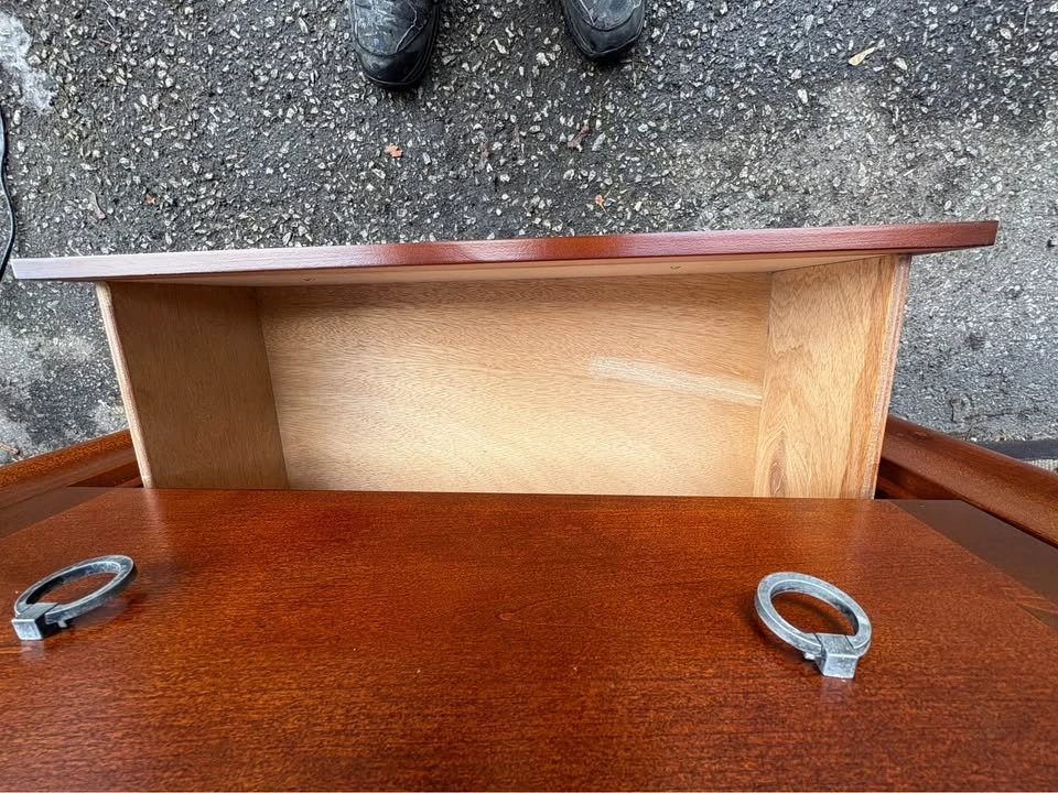 Has a rich cherry-like finish. Modern design with silver ring pulls. Drawers are clean, spacious and open and close smoothly.