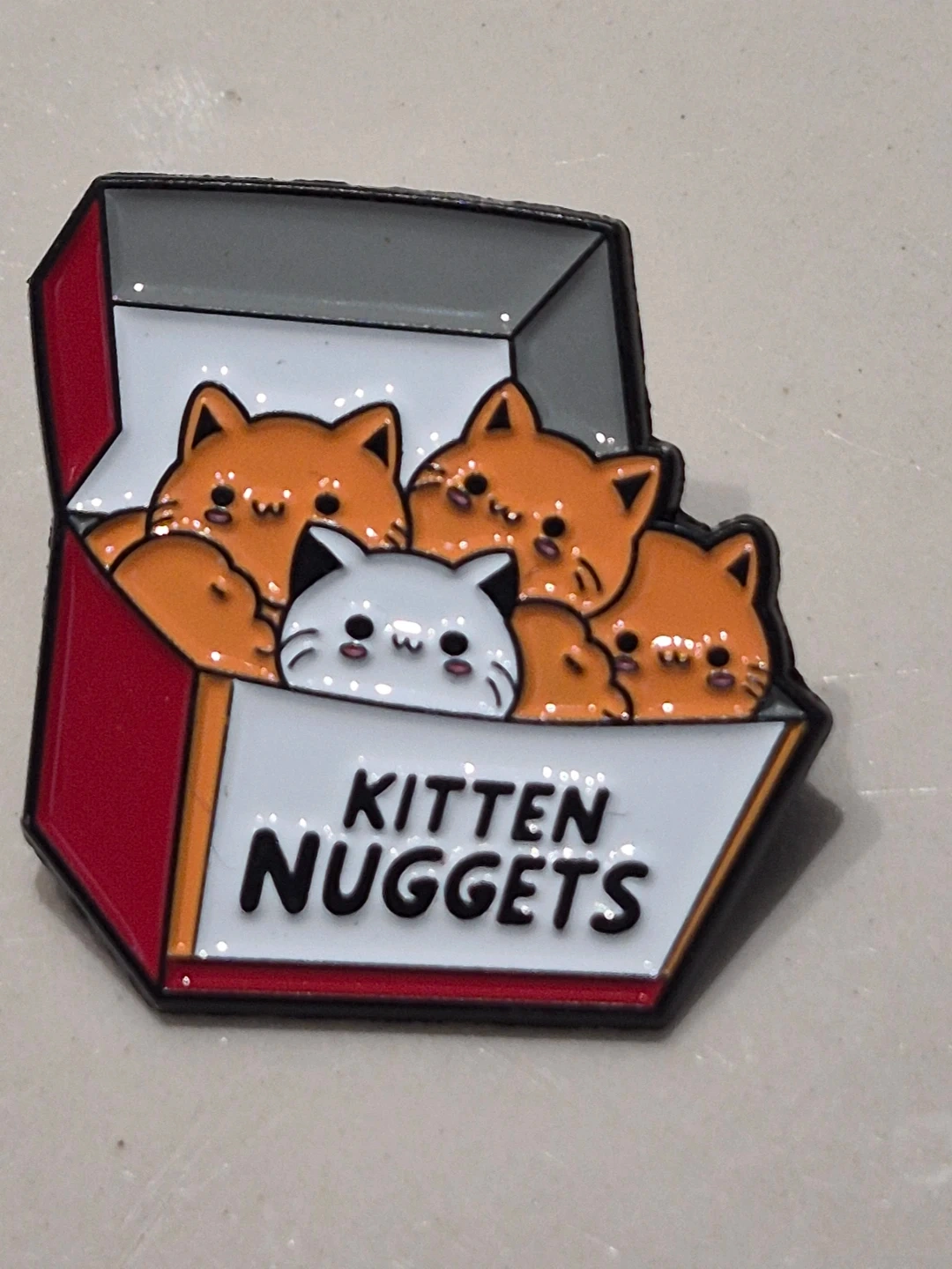 Cute Kitten Nuggets enamel pin! This pin features a box filled with adorable kittens. It's a fun accessory for any cat lover's jacket or bag.