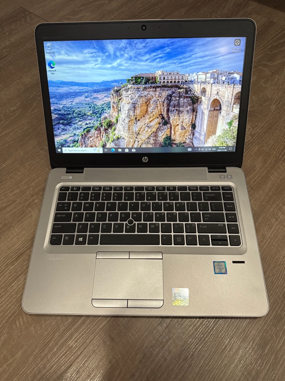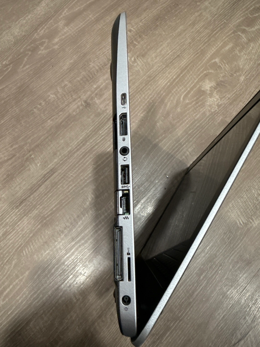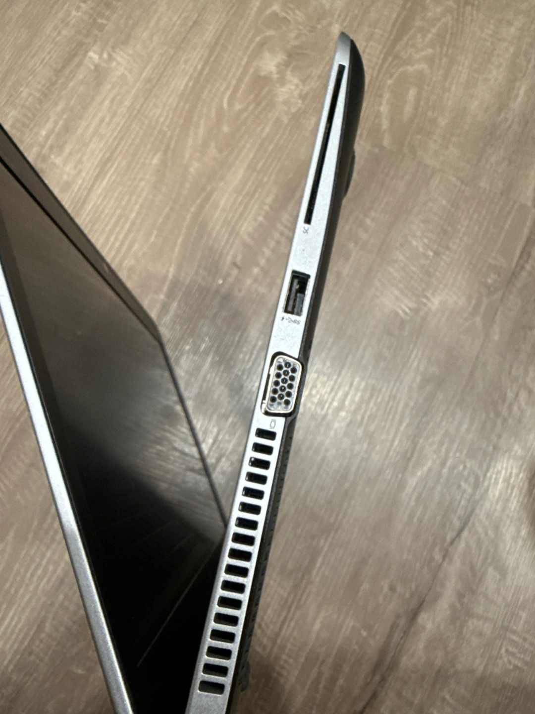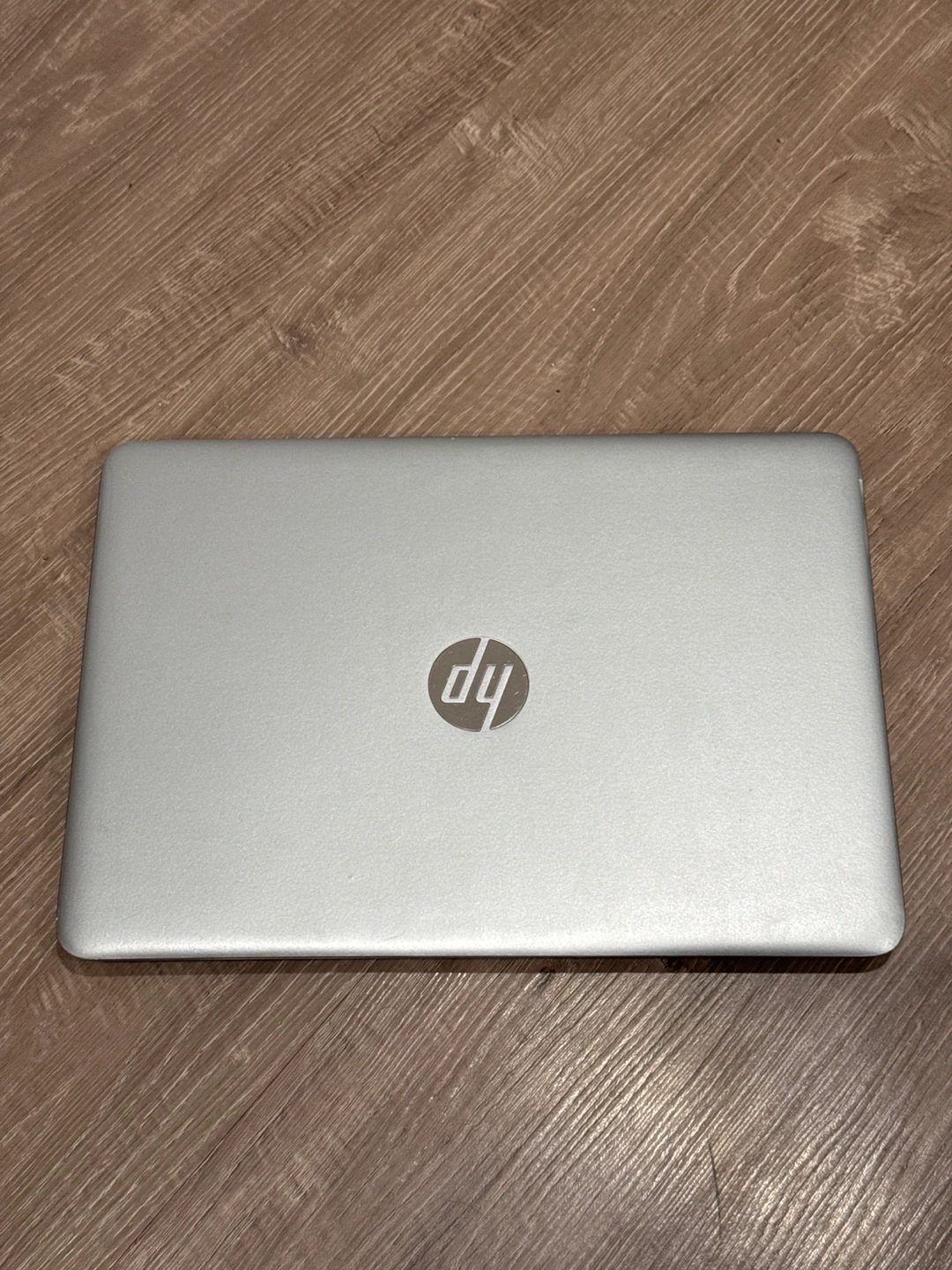 Silver HP EliteBook laptop, includes a charger. Has multiple ports including USB, HDMI, VGA, SD card, and headphone jack.