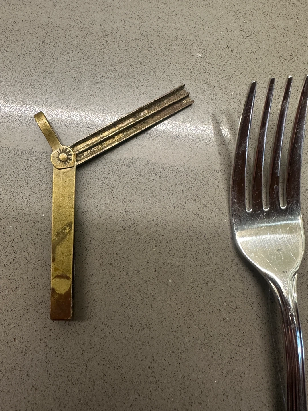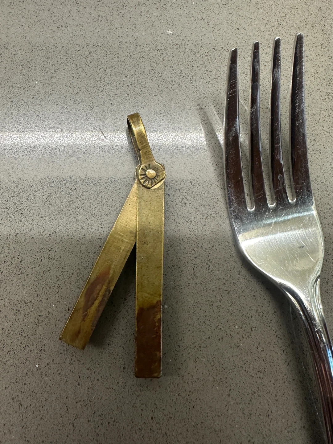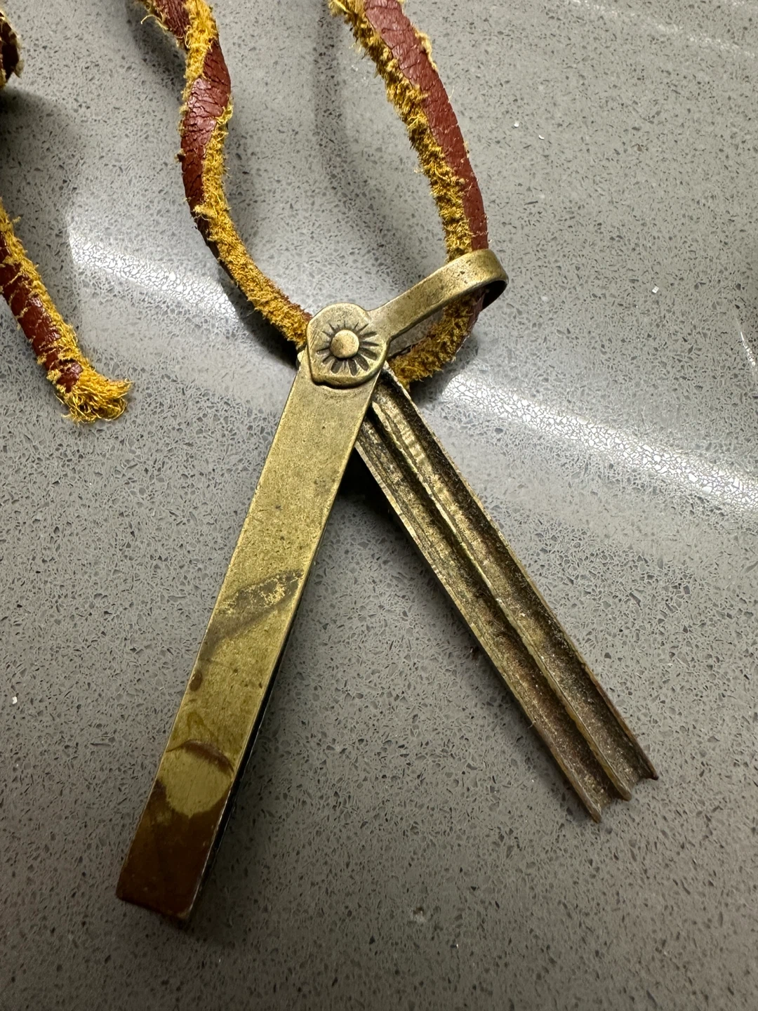 A beautiful and very interesting hand made solid brass Match striker for a pocket watch chain. Circa 1930’s. Center element swings out. Brass can be polished to a bright gold sheen if desired, but the aged patina is very nice. New leather strap is included for wear as a necklace.
