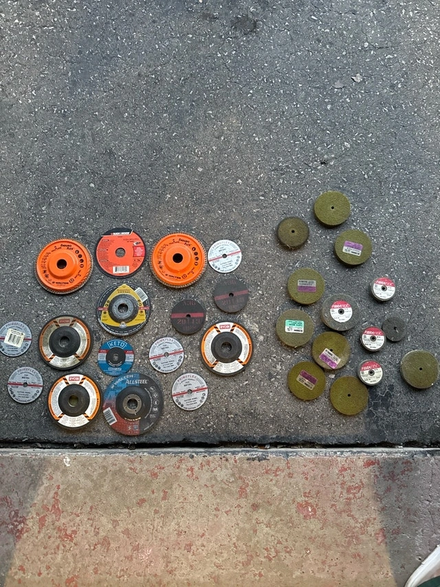 Selling a variety of used grinding and cut off wheels, perfect for metalworking or construction projects. This lot includes wheels of various sizes and grits for different applications. Types include grinding wheels, cut off wheels, and some abrasive discs. Sizes are assorted diameters to fit common angle grinders. Asking $45 for the lot. Cash accepted.