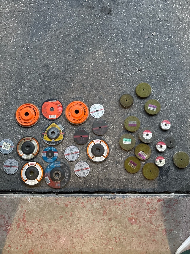 Selling a variety of used grinding and cut off wheels, perfect for metalworking or construction projects. This lot includes wheels of various sizes and grits for different applications. Types include grinding wheels, cut off wheels, and some abrasive discs. Sizes are assorted diameters to fit common angle grinders. Asking $45 for the lot. Cash accepted.