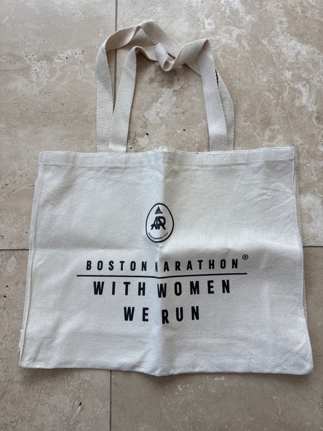 Off-white cotton tote bag. Features Adidas logo and Boston Marathon branding. Long cotton handles. Great for shopping or the gym.