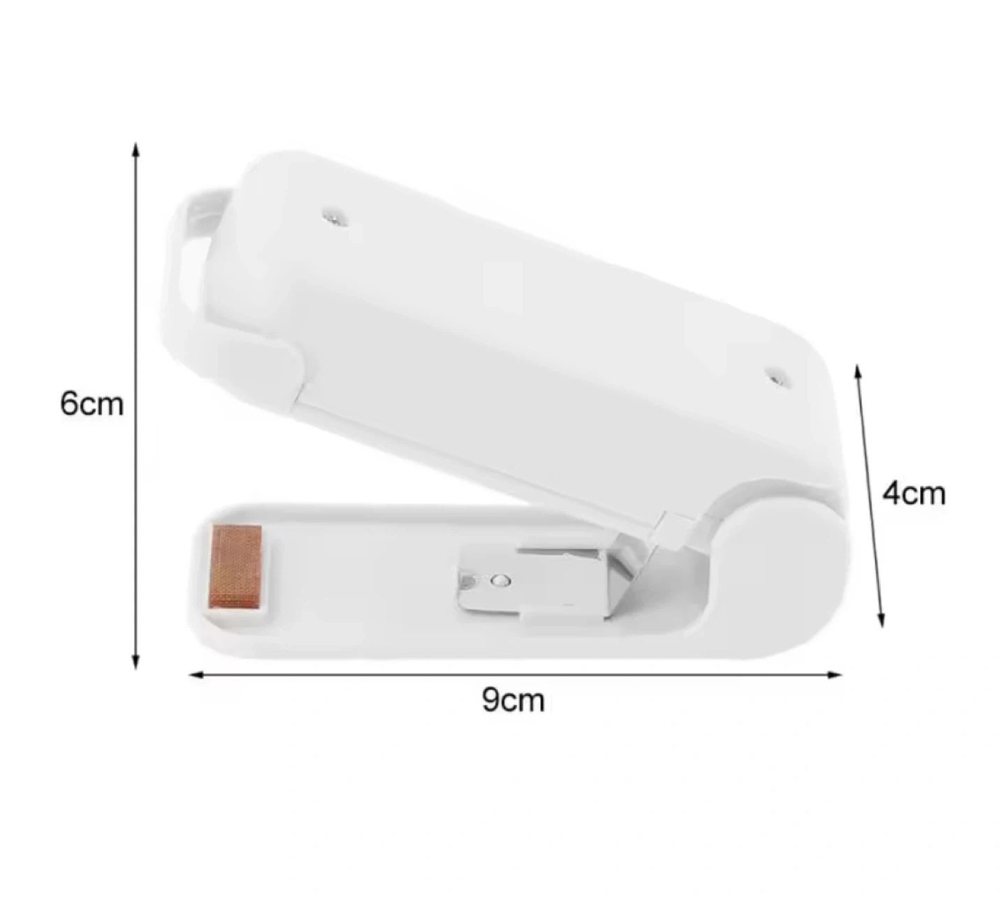 This handy portable mini heat sealer is perfect for resealing bags and keeping your snacks fresh! It's super easy to use and small enough to store anywhere. It measures 6cm x 4cm x 9cm.