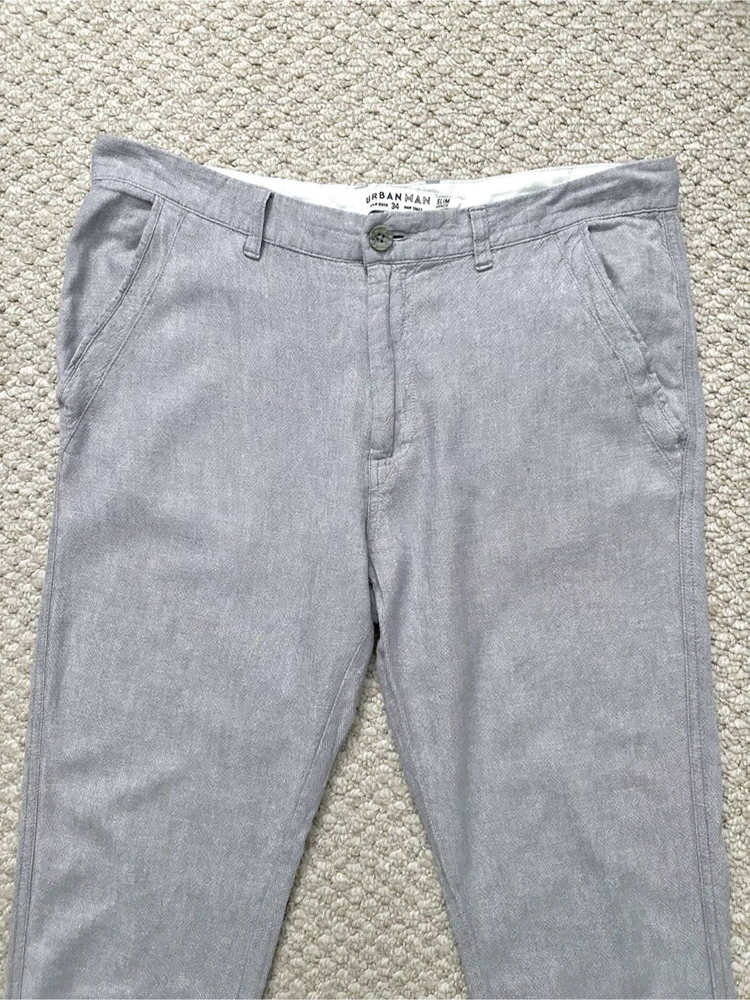 Men’s grey rayon/linen blend pants, size 34 waist, 32 length, regular cut (not fitted), clean, no damage