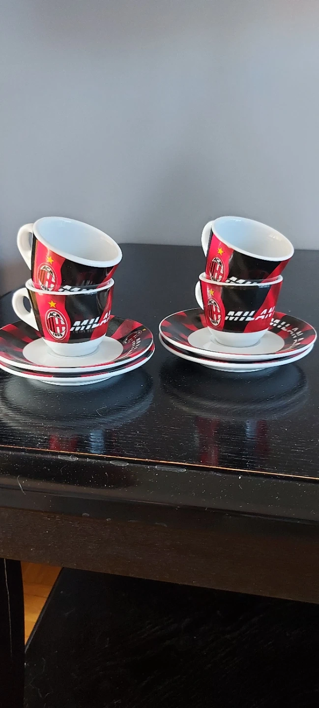 Set of four espresso cups and saucers featuring the AC Milan logo and colours. Ceramic material. Perfect for any soccer fan!