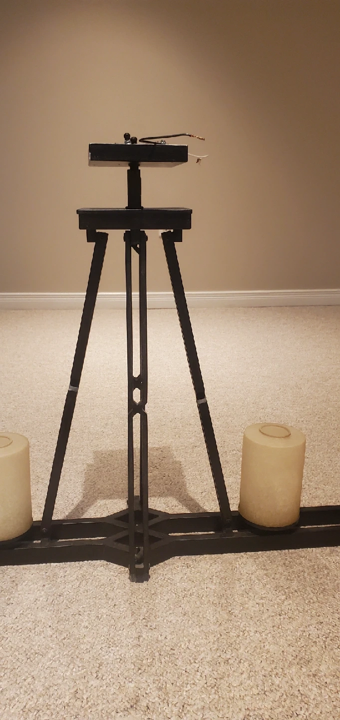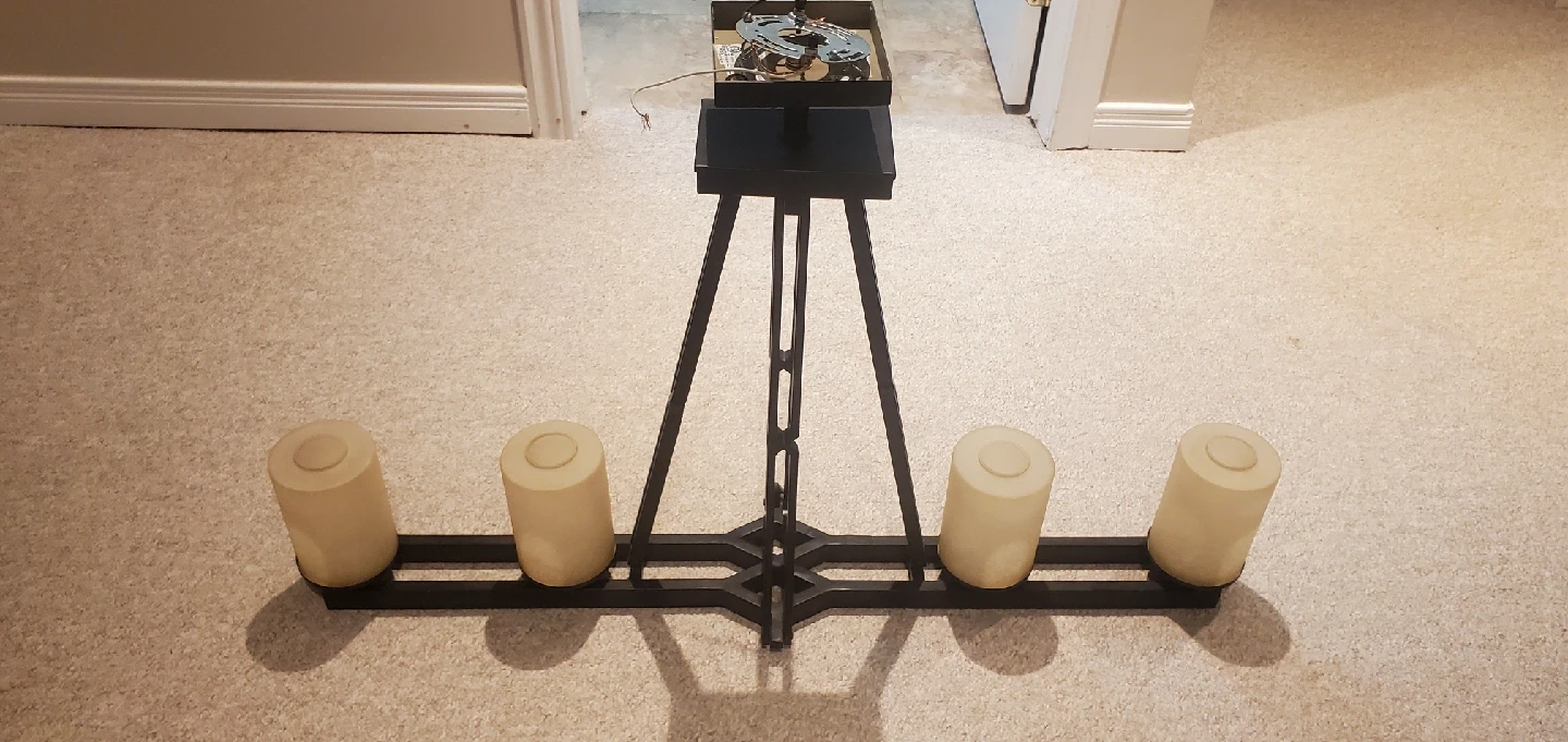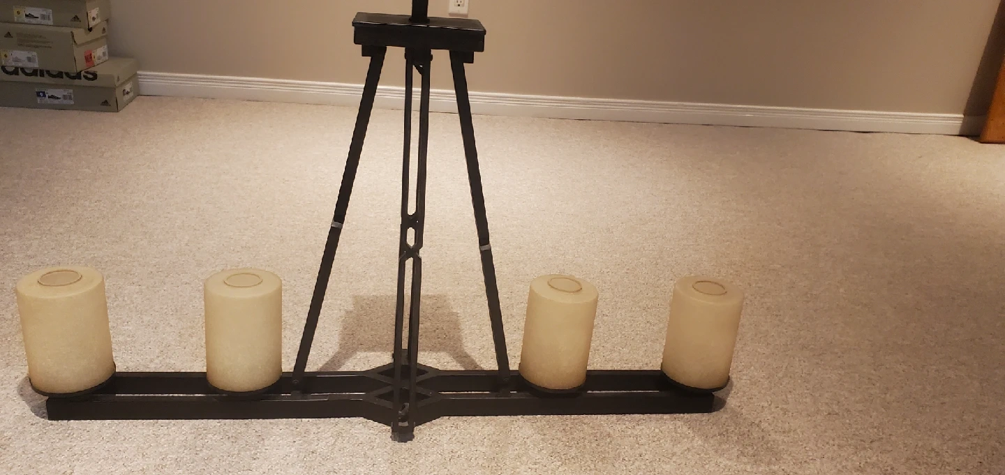 Selling a chandelier with four lights. It is black in colour and has a unique design! Great for adding a touch of elegance to any room.