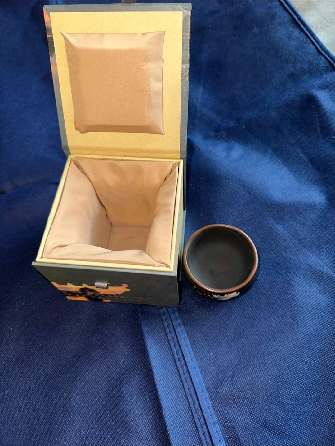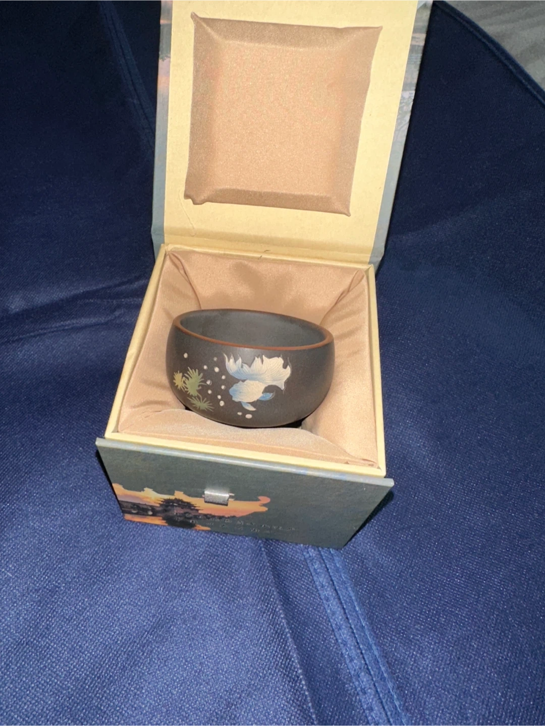 This is a single ceramic tea cup, decorated with floral motifs. It comes with a decorative gift box featuring a scenic landscape and bridge. The box is lined with satin and includes a ribbon closure. The cup is dark brown with painted designs. Handmadeš¹original price is very high but it is moving sale