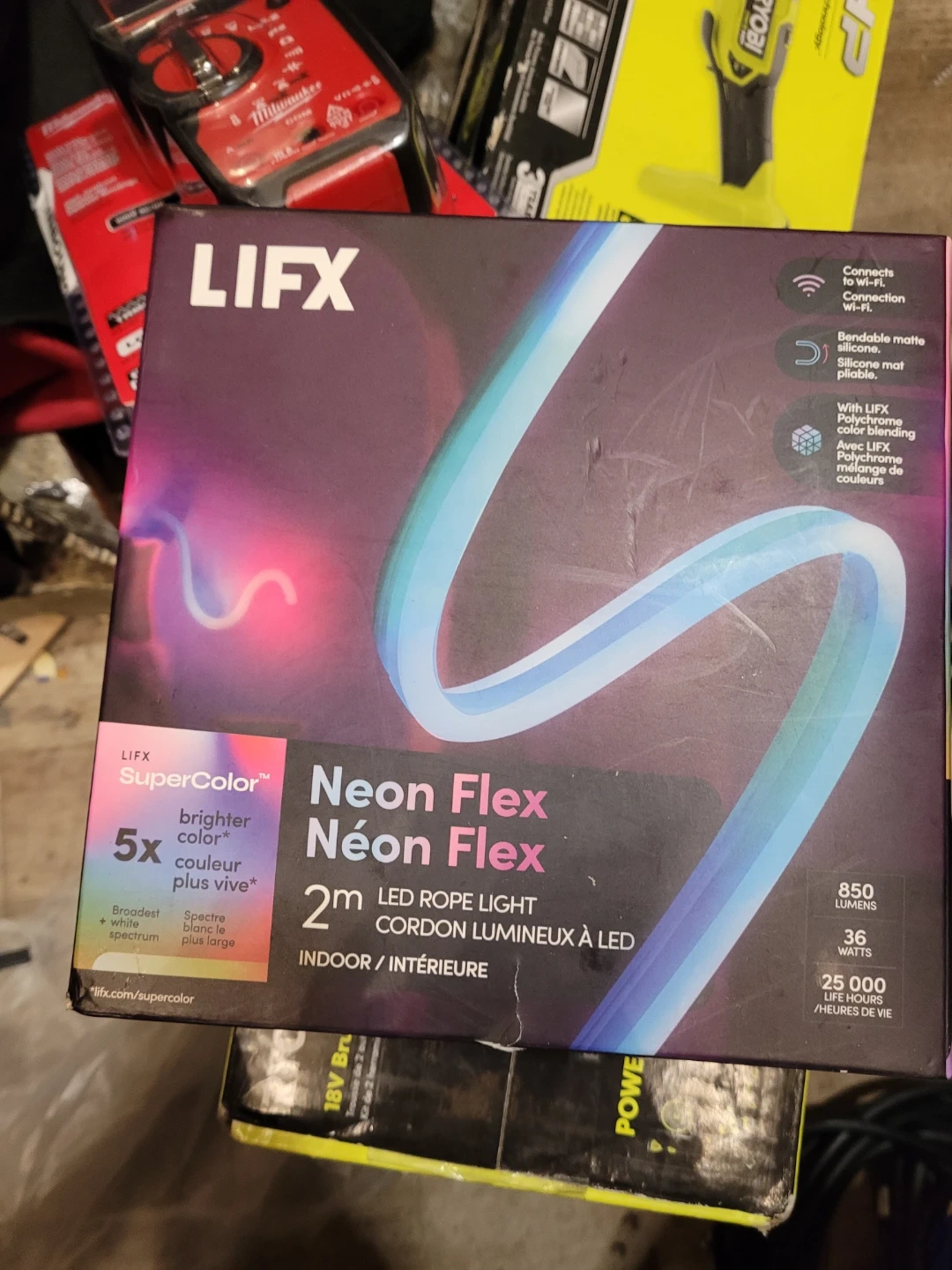 This is a 2-meter LIFX Neon Flex LED rope light. It's bendable with a matte silicone finish and connects to Wi-Fi. It offers 850 lumens and 36 watts with 25,000 life hours. Price firm.