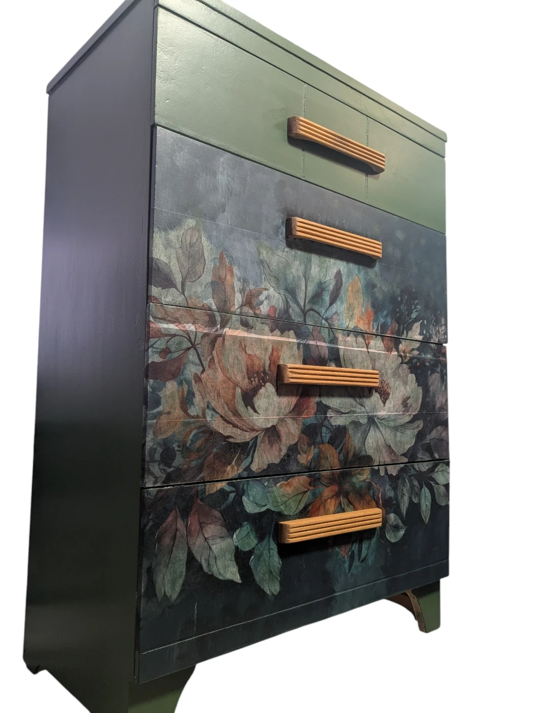 Stylish upcycled dresser finished in a soft green with a floral decoupage image on the drawer fronts. Sealed for protection and paired with natural wood handles for a clean, modern look. Works great as a small dresser, or accent storage.