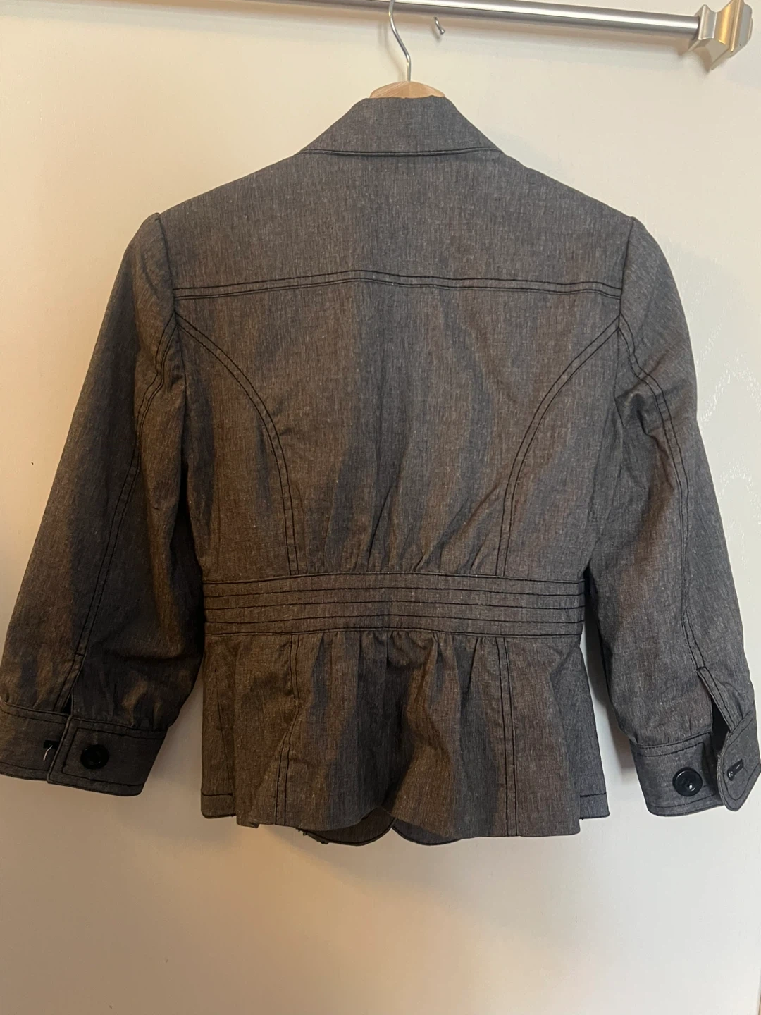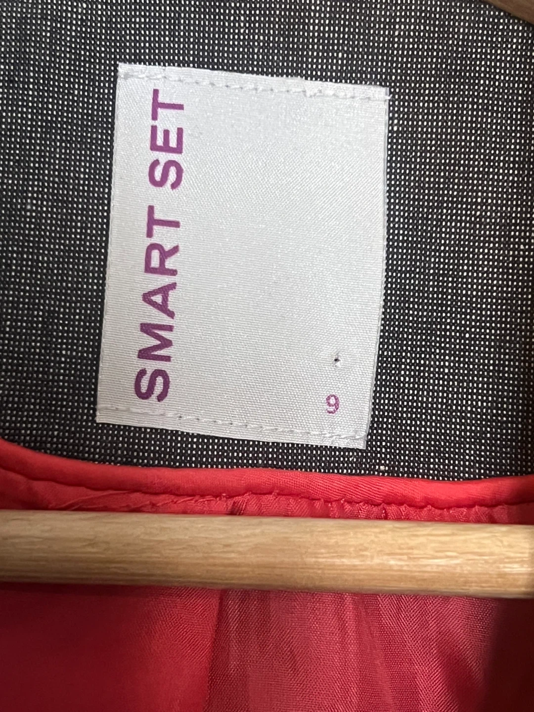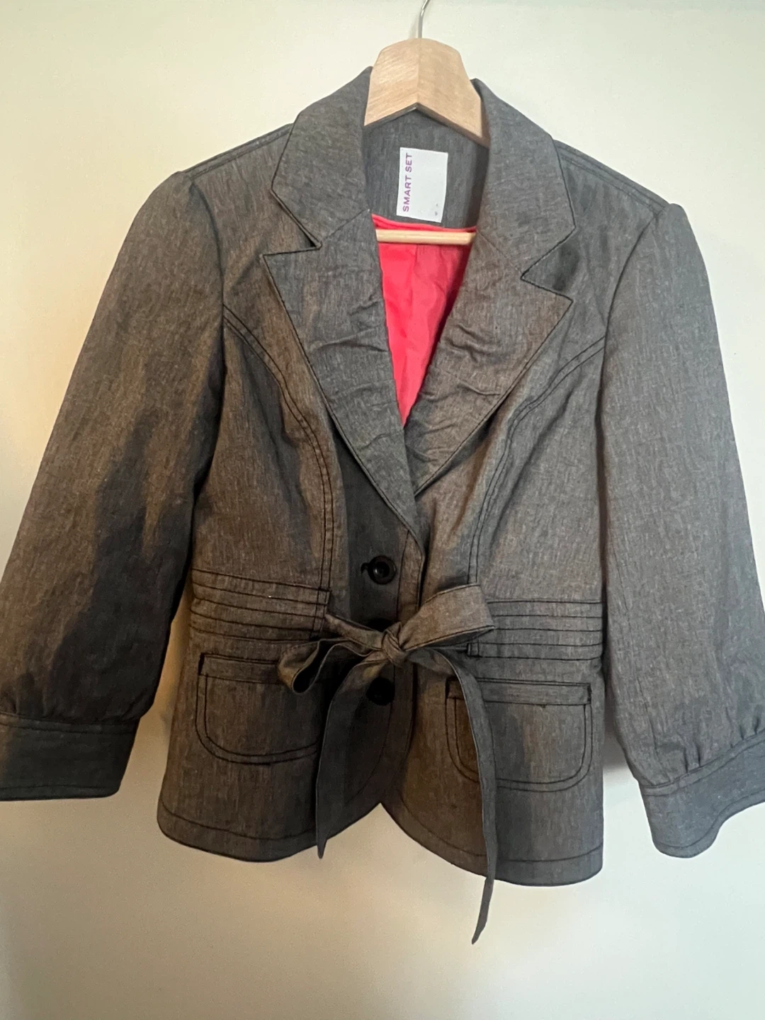 This Smart Set blazer is a stylish grey with a bright pink lining. It's made from a cotton-spandex blend for comfort. The jacket features a single button closure and a tie-waist detail.
