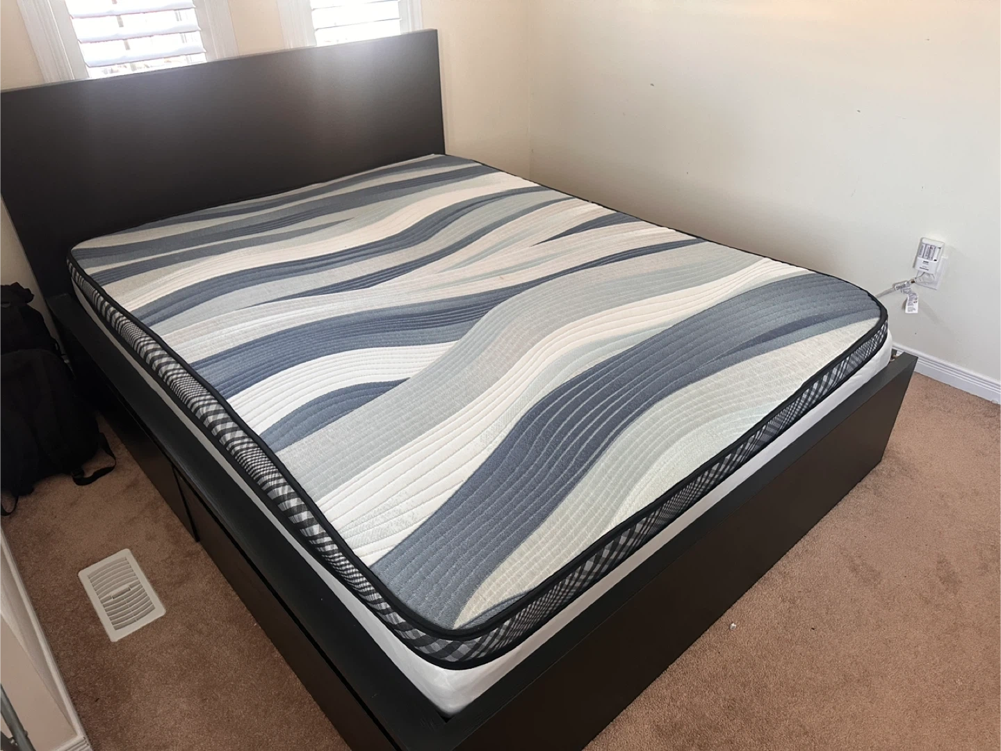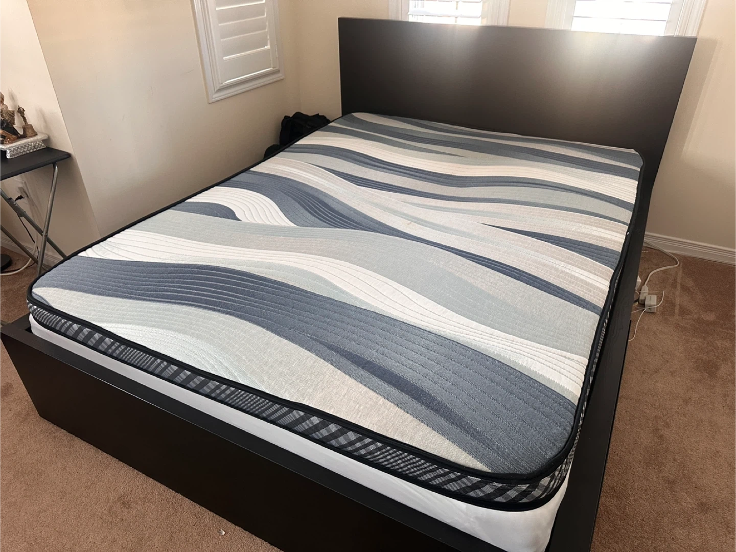 Selling a queen size mattress. It features a wavy pattern in shades of grey and white. It's in good condition and ready for a new home!