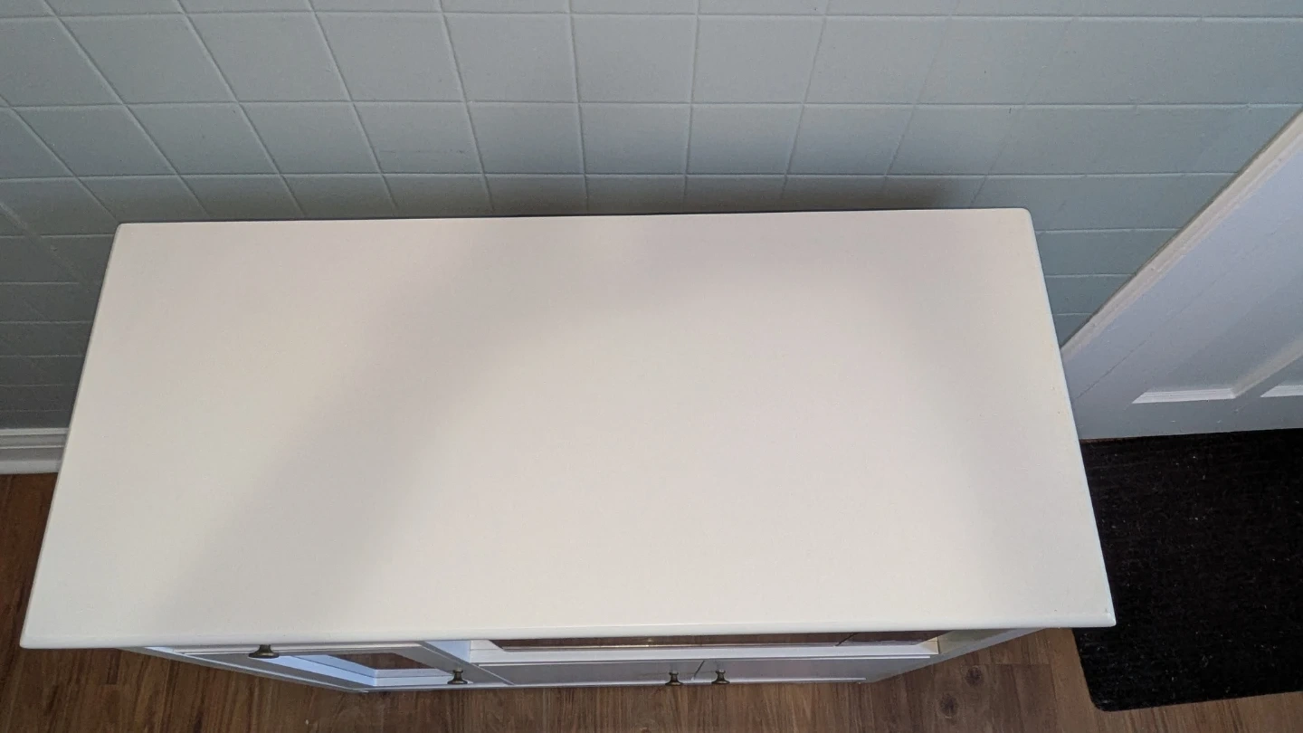 This white kitchen cart is perfect for organizing your microwave and kitchen essentials. It features a drawer, a cabinet with a glass door, and a lower cabinet with two doors. The microwave area has an open shelf above it. It's made of particle board and has metal hardware.