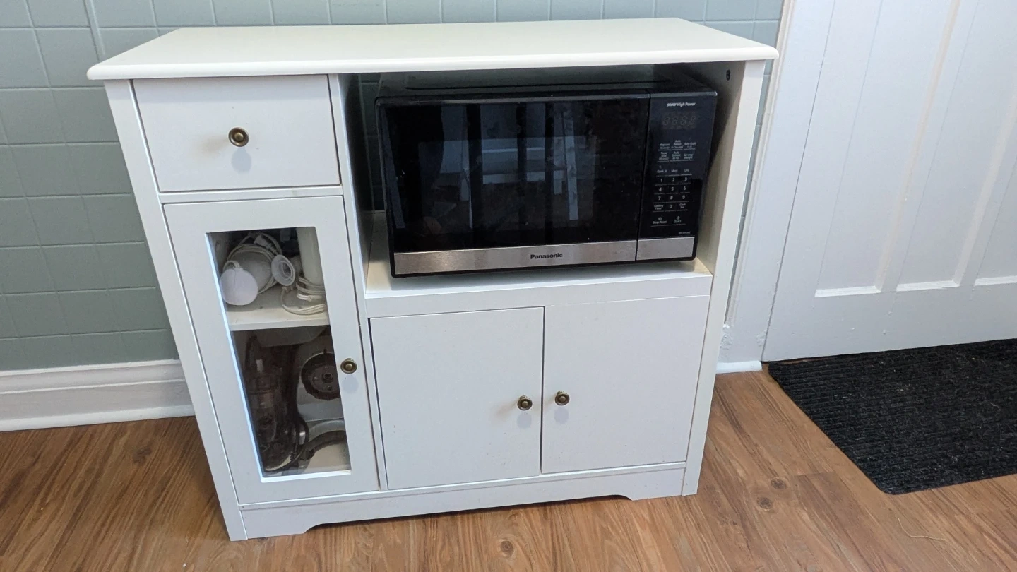 This white kitchen cart is perfect for organizing your microwave and kitchen essentials. It features a drawer, a cabinet with a glass door, and a lower cabinet with two doors. The microwave area has an open shelf above it. It's made of particle board and has metal hardware.