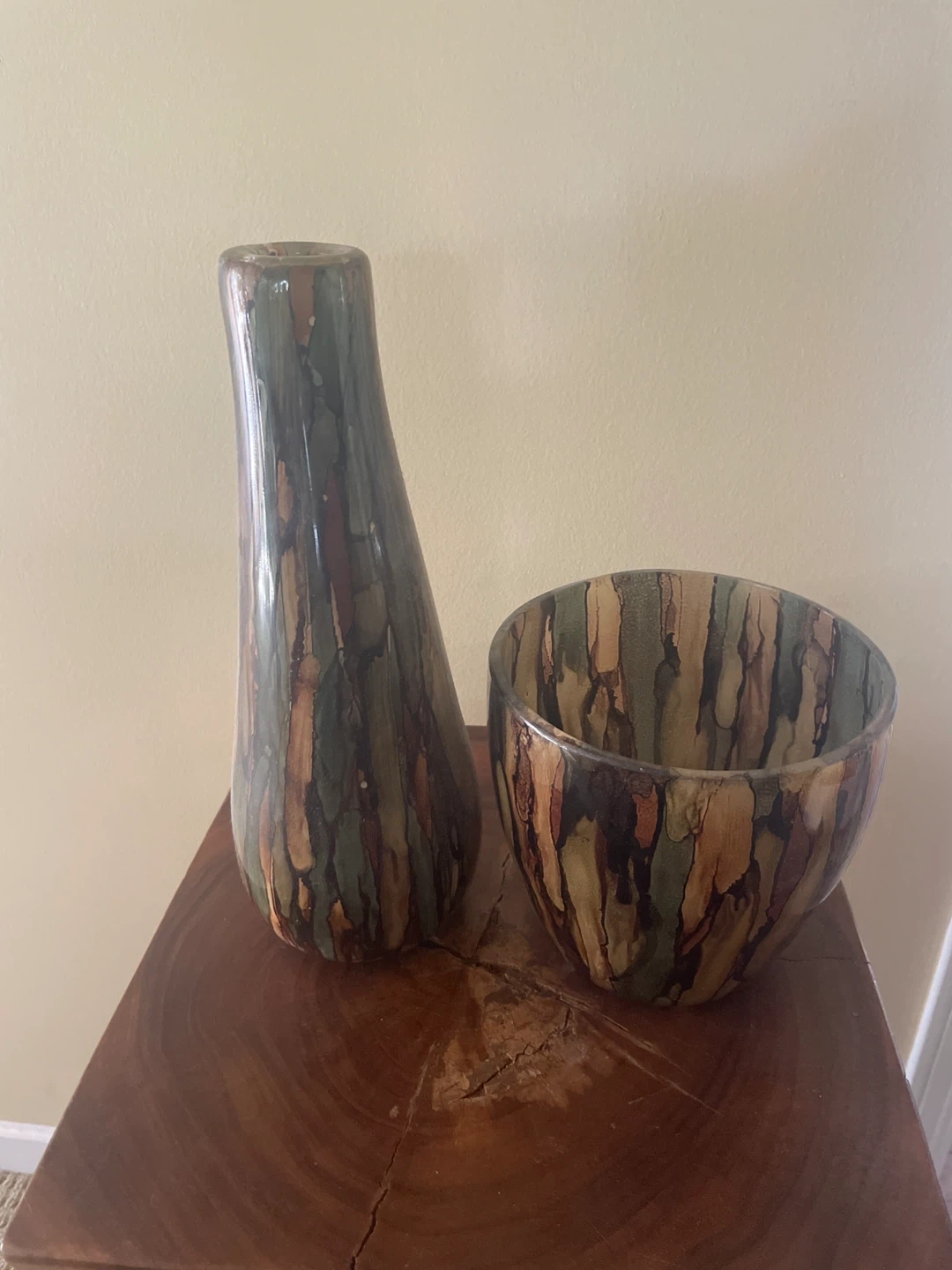 Looking to add a unique touch to your home decor? I'm selling a decorative vase and bowl set. The set features a beautiful colour pattern that would look great in any space. It's in great condition and ready for a new home!