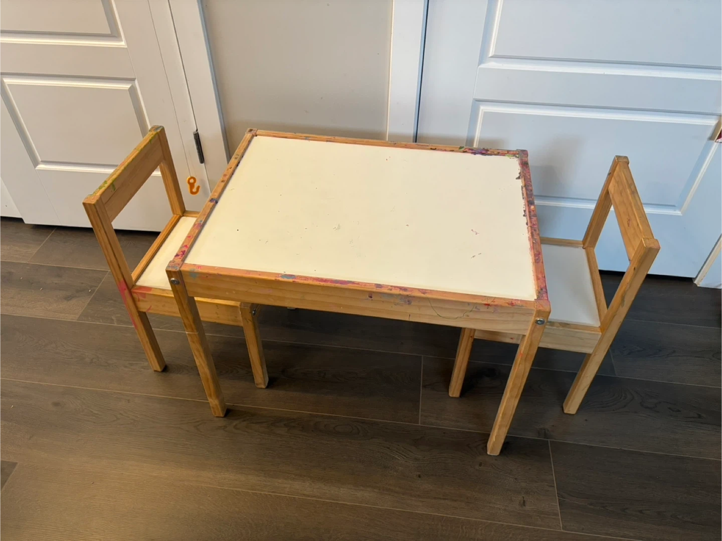 A cute little table and chairs set for kids! Perfect for arts and crafts, snack time, or just a fun place to hang out. It's in good condition and ready for a new home where it can inspire creativity and play. There are some paint stains but it’s fine otherwise.