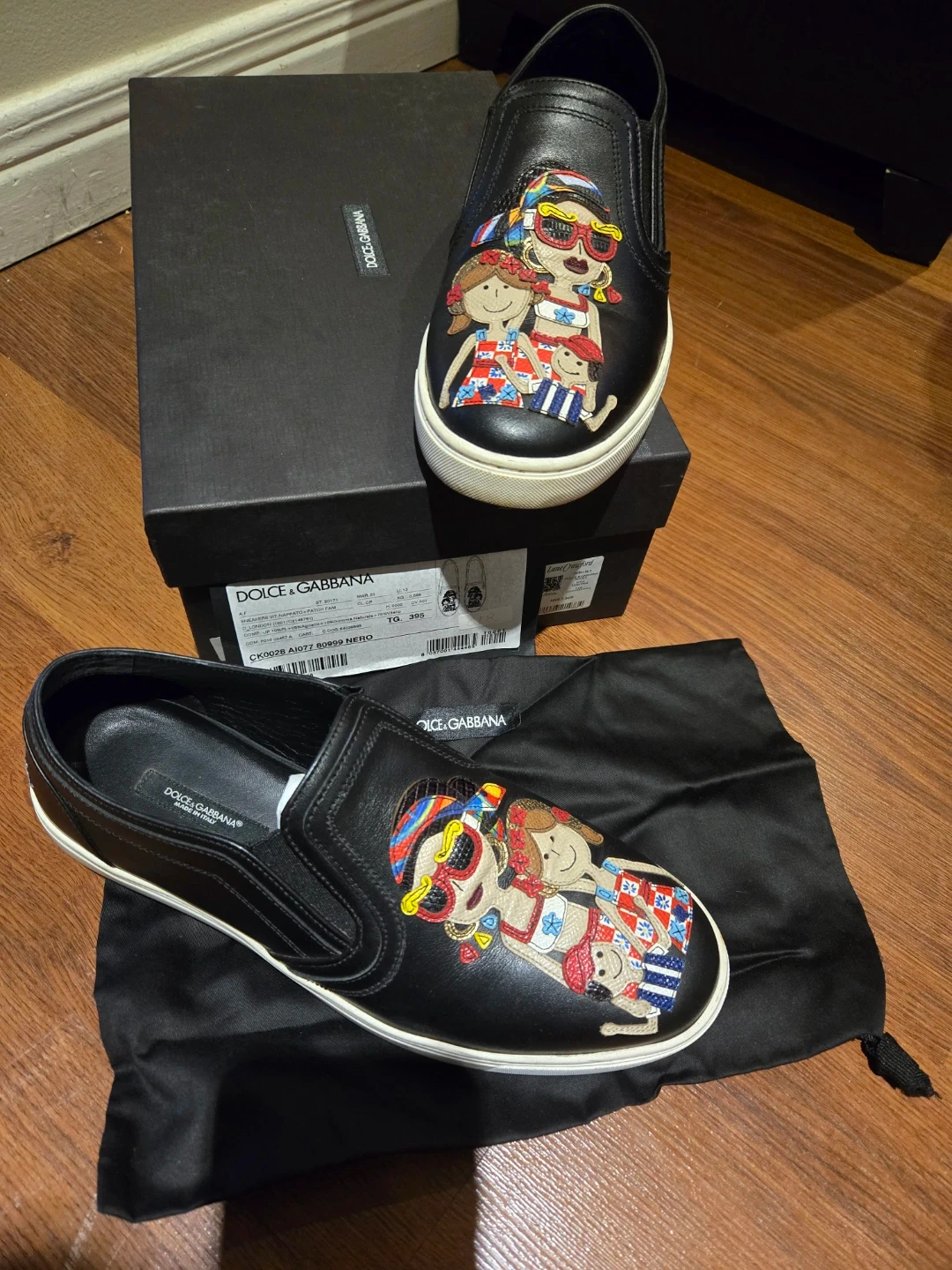 Dolce & Gabbana family patch slip-on sneakers in black leather. Features a fun patch appliqué on the front. Comes with original box and dust bag. Made in Italy.