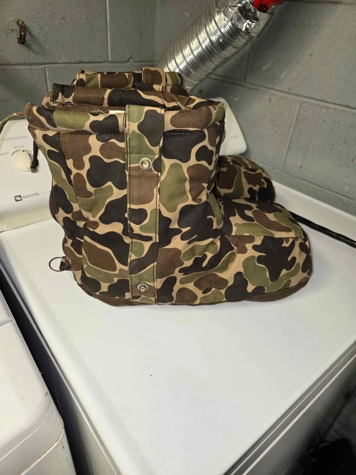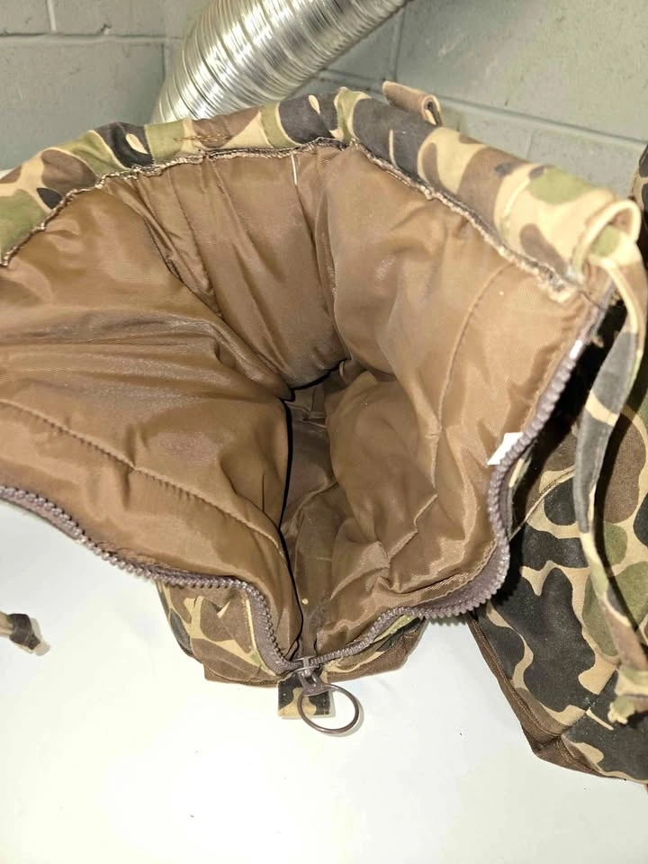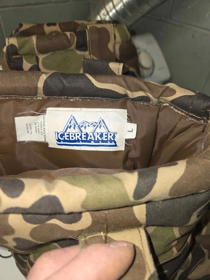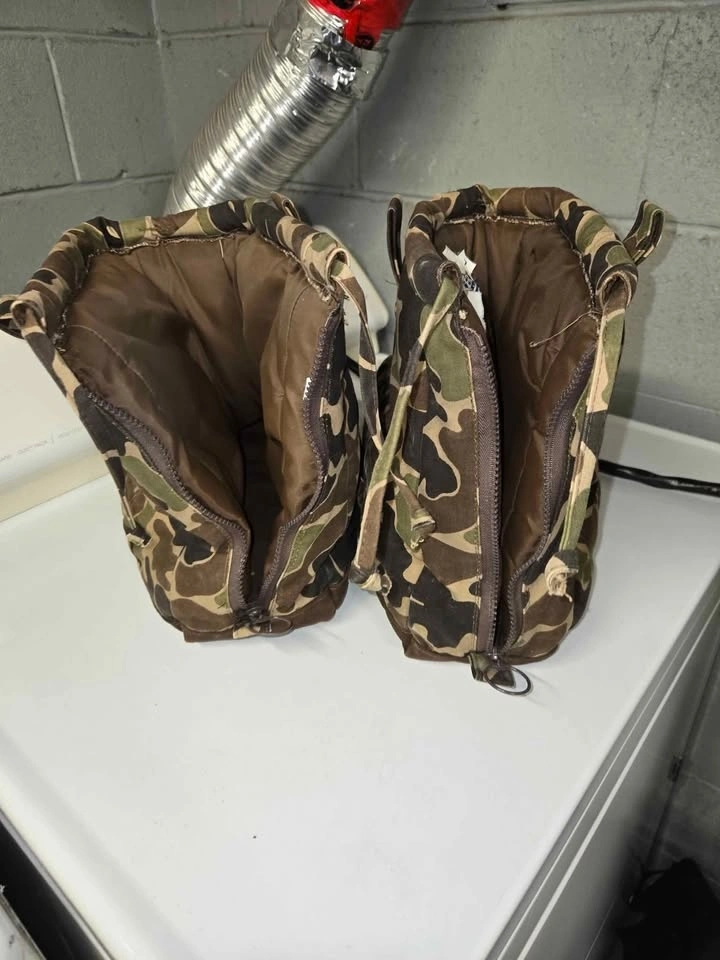 Icebreaker Boot Blankets are a classic piece of cold-weather gear, designed to be worn over your boots once you reach your hunting stand or ice fishing hole. At $75, this is a fair price for a pair in good condition. These are the "original" heavy-insulation style in a vintage woodland/duck camo, highly sought after for their warmth. They use thick high-loft insulation (Hollofil) to trap heat and are much warmer than thinner "boot insulator" sleeves. The soles are a soft, slip-resistant vinyl. You carry them to your spot using the belt loops/straps and zip them on once you sit down. The rear zipper and top drawstring make them easy to slide over bulky boots. Sizing: Large fits boot sizes 10-12, and can accommodate some heavy rubber boots. Quick Tip: Put them on while your boots are still warm from the walk in. If it's truly sub-zero, you can drop a hand warmer packet inside on top of your boot toe for a "toaster" effect.
