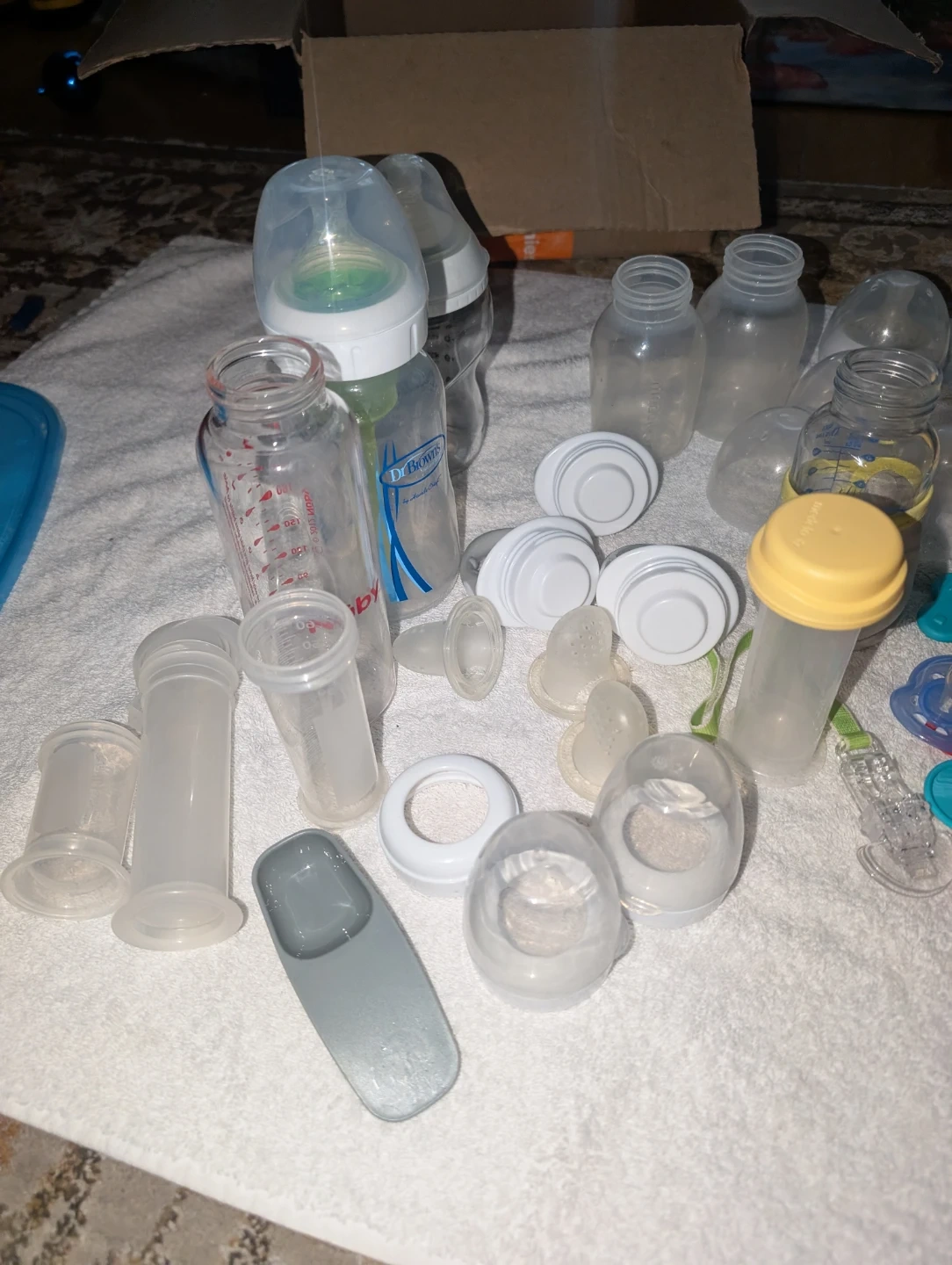 Includes various baby bottles, nipples, and caps. Some bottles to be Dr. Brown's brand. These are great for feeding your little one. Multiple sizes and styles are included. 3 glass bottles. 2 medela nipples. Lids. Fruit and yogurt feeders
