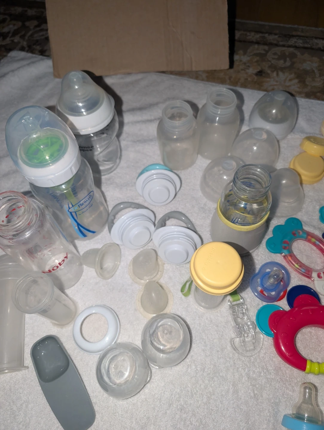 Includes various baby bottles, nipples, and caps. Some bottles to be Dr. Brown's brand. These are great for feeding your little one. Multiple sizes and styles are included. 3 glass bottles. 2 medela nipples. Lids. Fruit and yogurt feeders