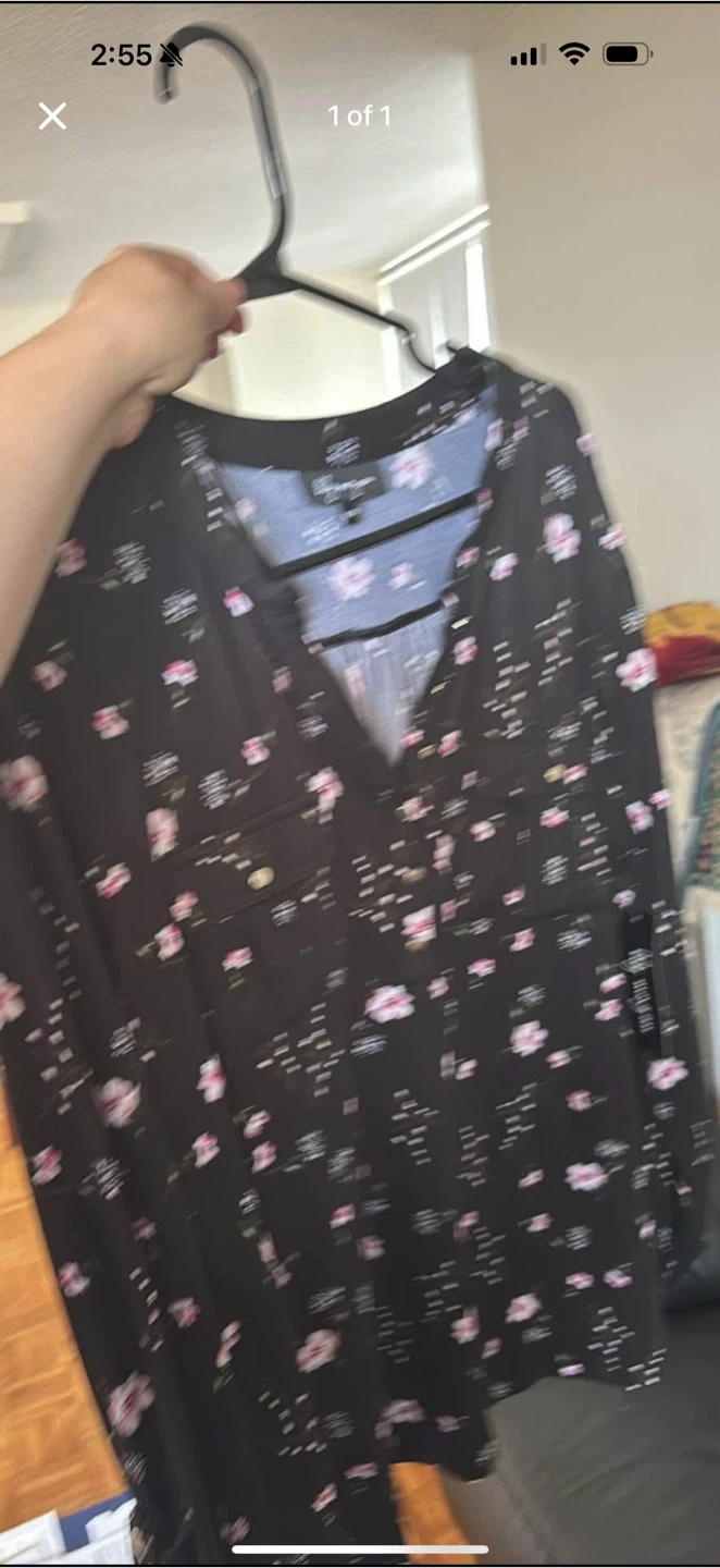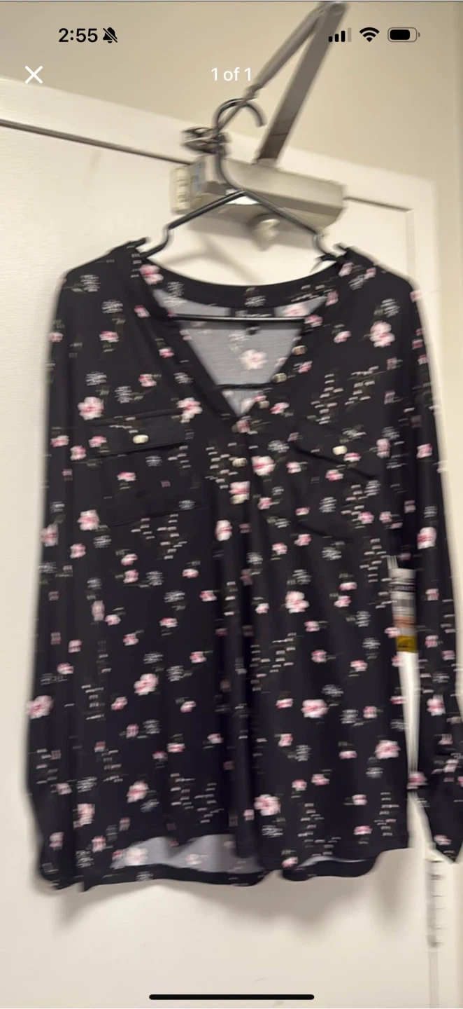 This black long-sleeved blouse features a delicate pink floral print. It has a V-neck and two chest pockets. Made from a comfortable fabric.