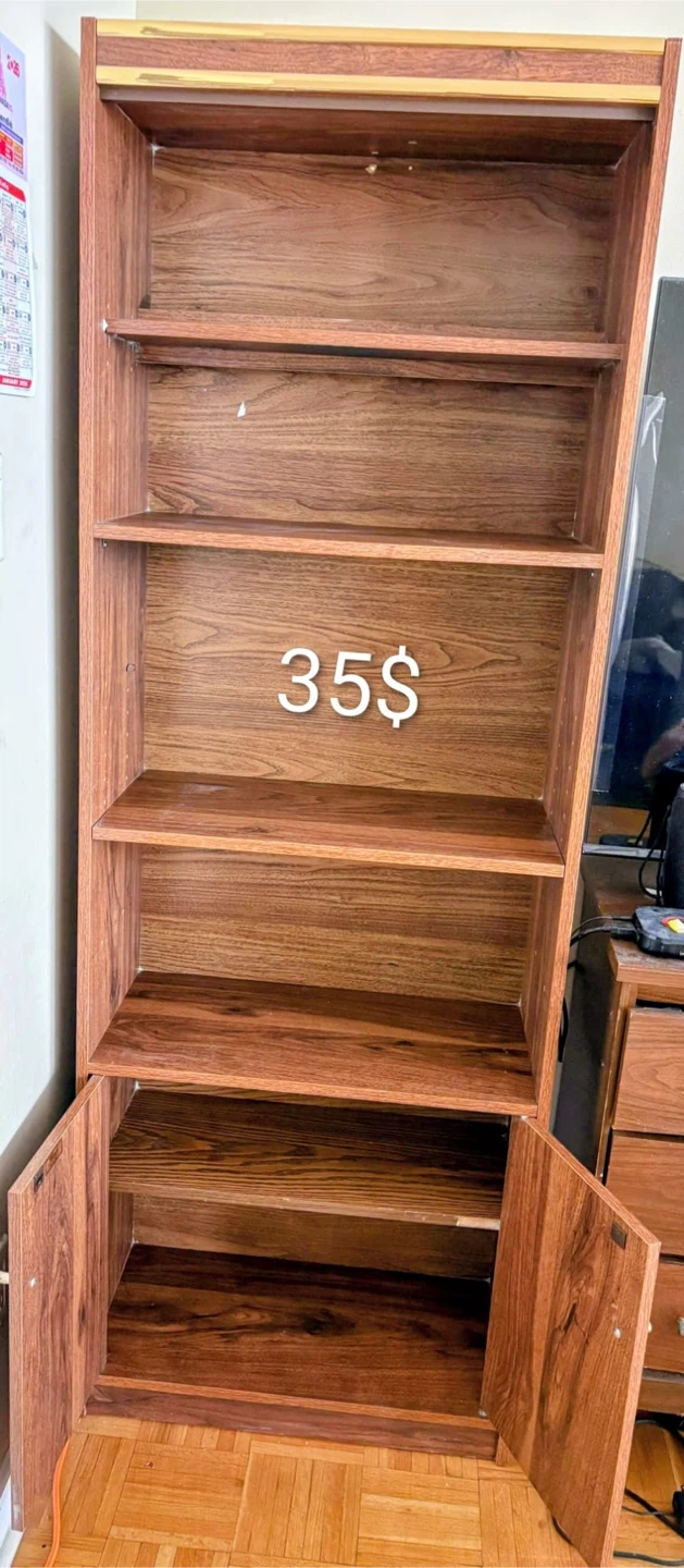 This is a tall, wooden bookshelf with multiple shelves. It has a cabinet at the bottom with two doors. The wood has a reddish-brown, grained finish.