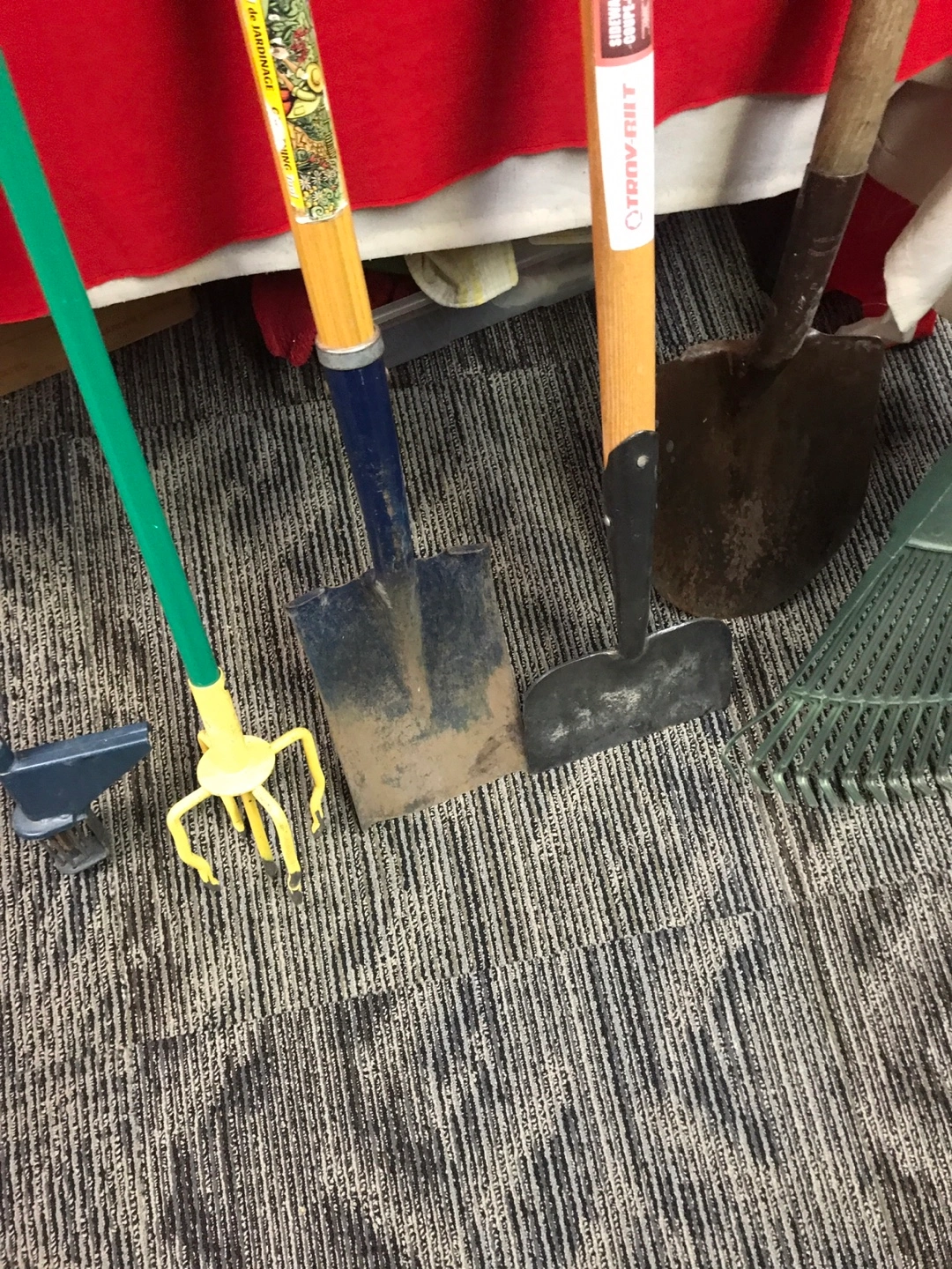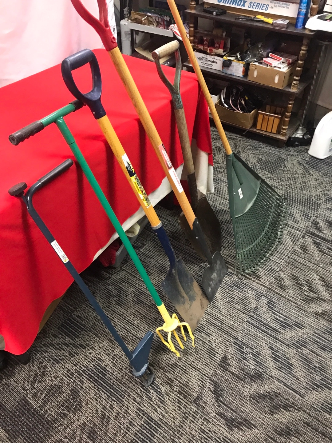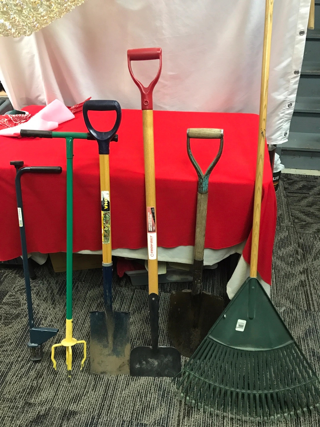 A collection of essential garden tools. Includes two shovels, a leaf rake, and a hand cultivator with a yellow fork. Also includes a unique wheeled edging tool. These tools are ready for your next yard project! All for $70.