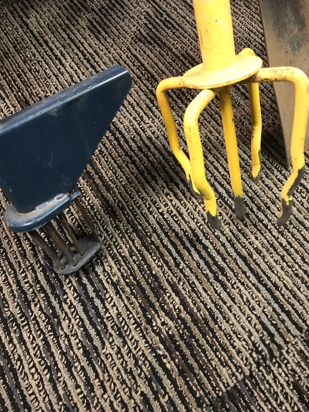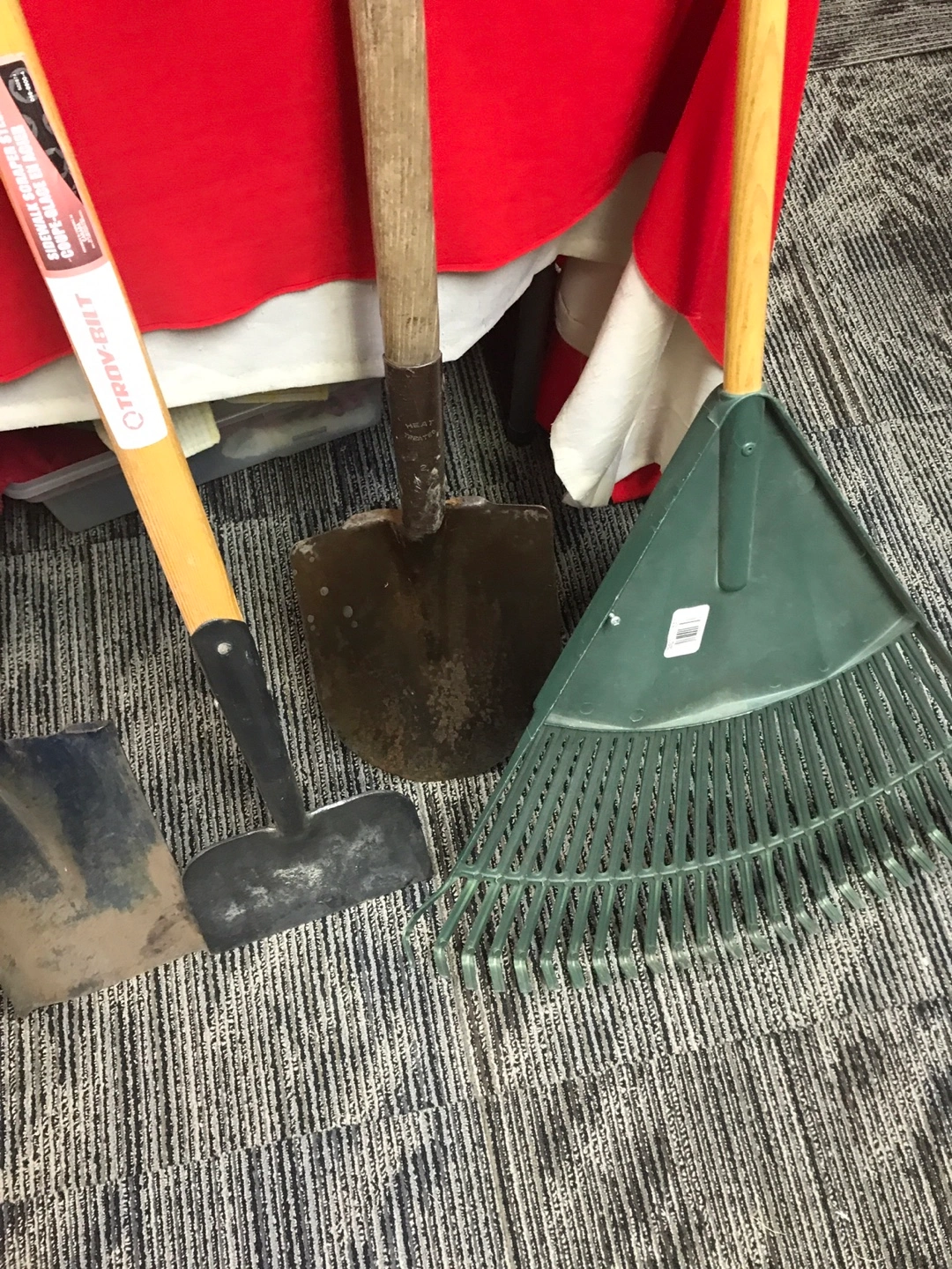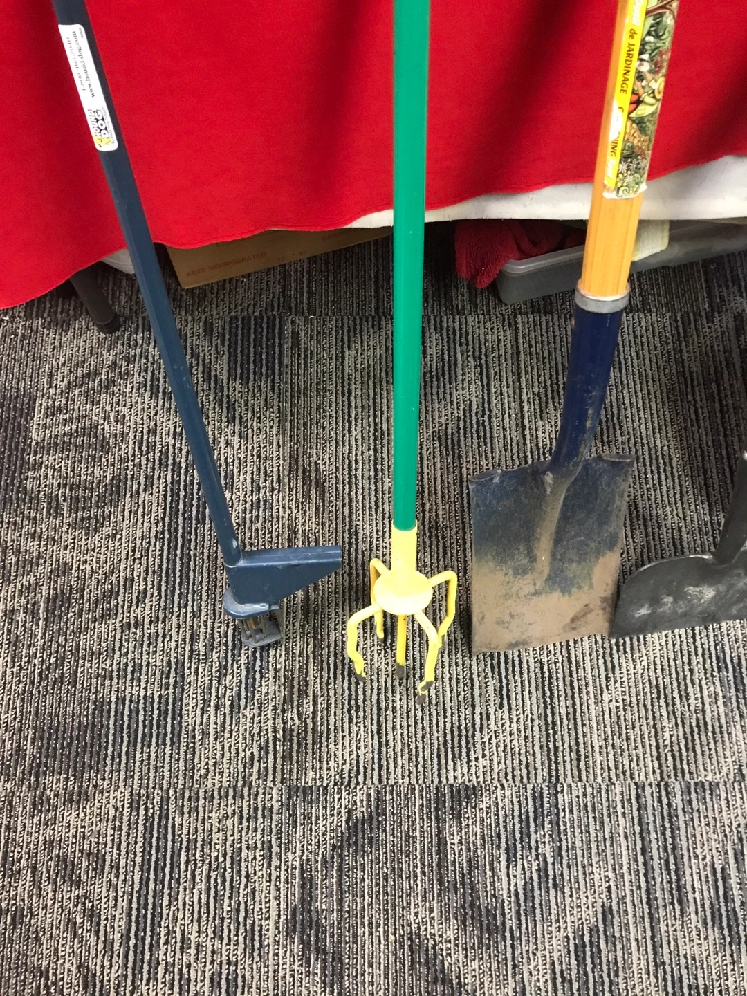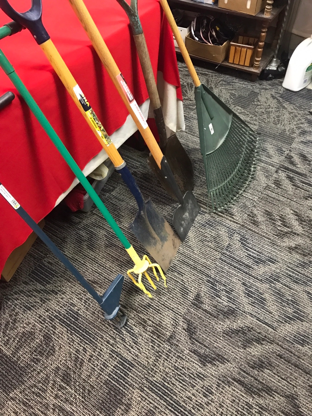 A collection of essential garden tools. Includes two shovels, a leaf rake, and a hand cultivator with a yellow fork. Also includes a unique wheeled edging tool. These tools are ready for your next yard project! All for $70.