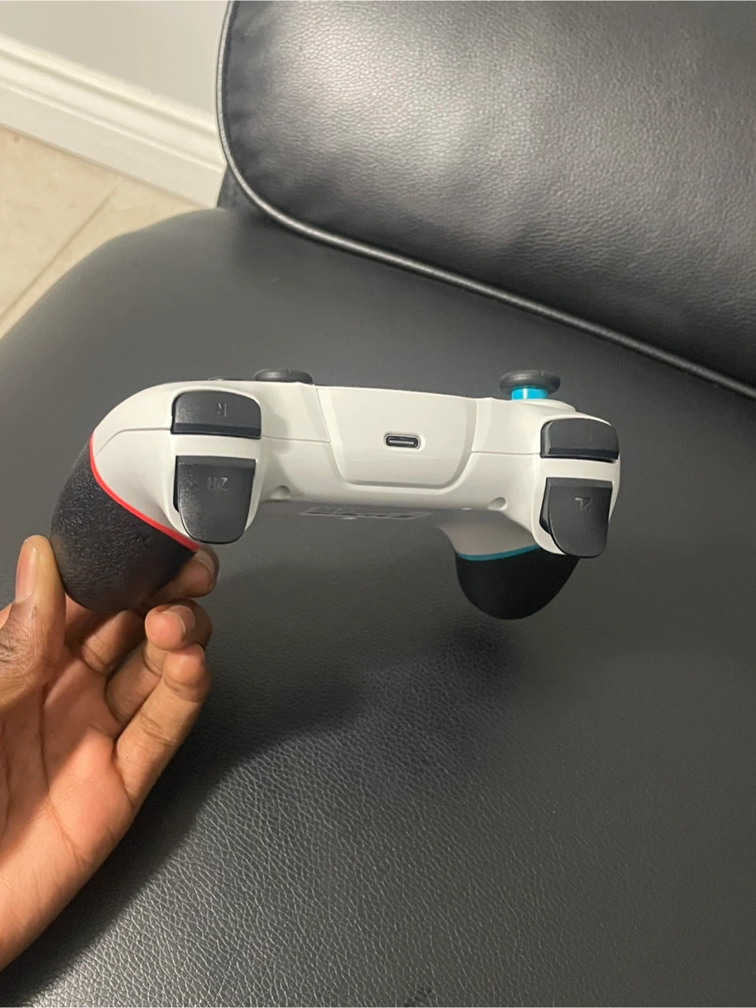 This is a wireless controller for Nintendo Switch. It's white with red and blue accents on the grips. It charges via USB-C and features a classic button layout. You can also use it for your phone or tablet or laptop and tv