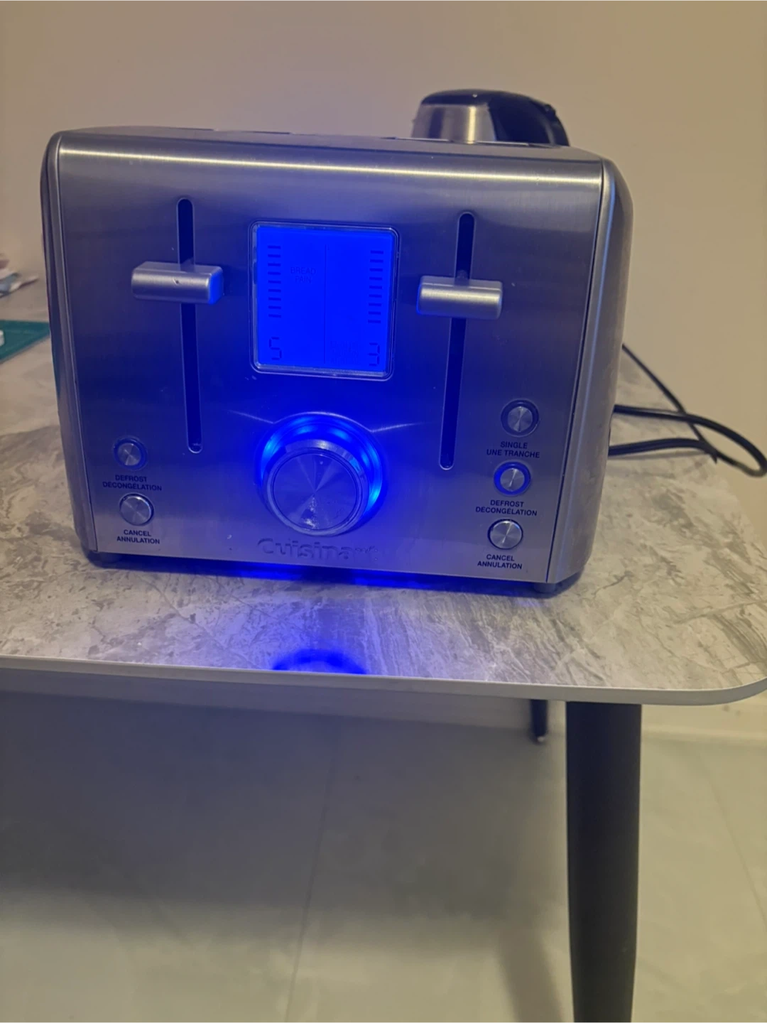 Selling a Cuisinart toaster. It has settings for defrost/decongélation and single tranche. Also has cancel/annulation button