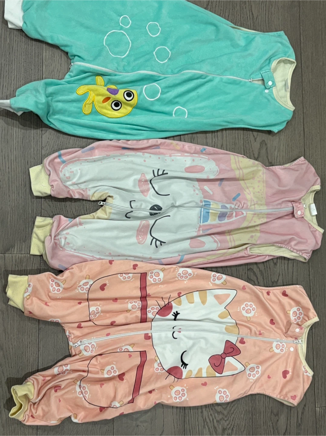 Selling three baby sleep sacks in great condition! They feature adorable designs: a yellow fish, a cute bunny, and a sweet kitty. Perfect for keeping your little one snug and secure during sleep time