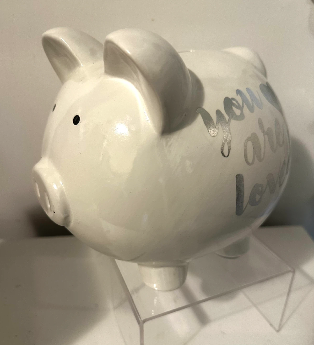 A cute white ceramic piggy bank. It features the text "you are loved" in silver lettering. This would be a lovely gift for a child to start saving their allowance!