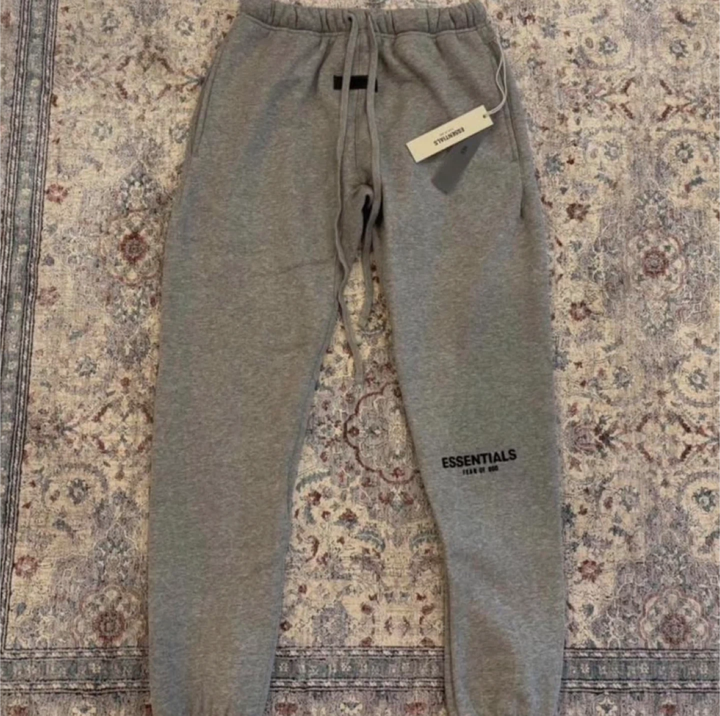This is a grey ESSENTIALS Fear of God hoodie and sweatpants set. The set includes a hooded sweatshirt with a front pocket and drawstring sweatpants. It's made of a soft cotton blend.