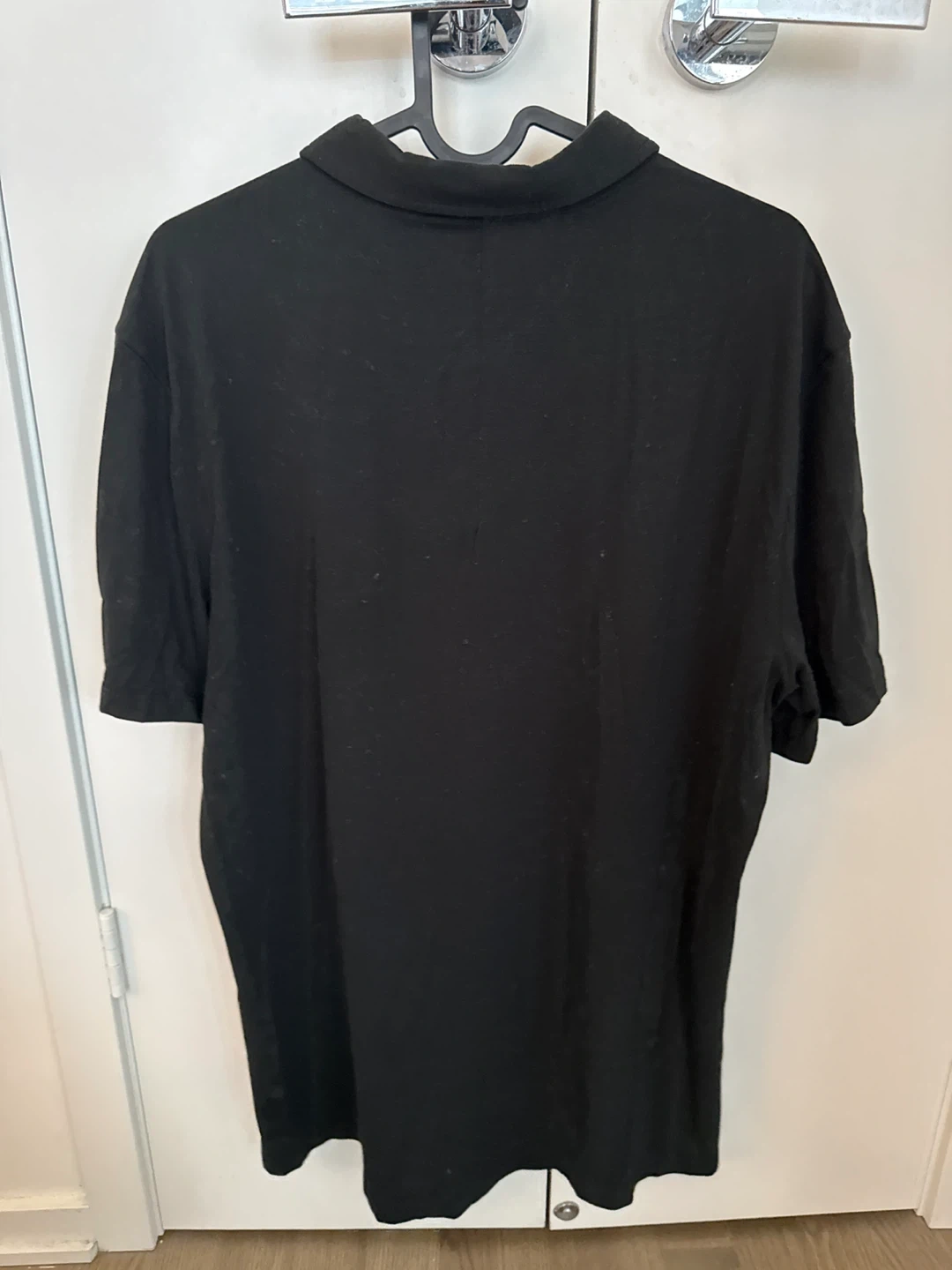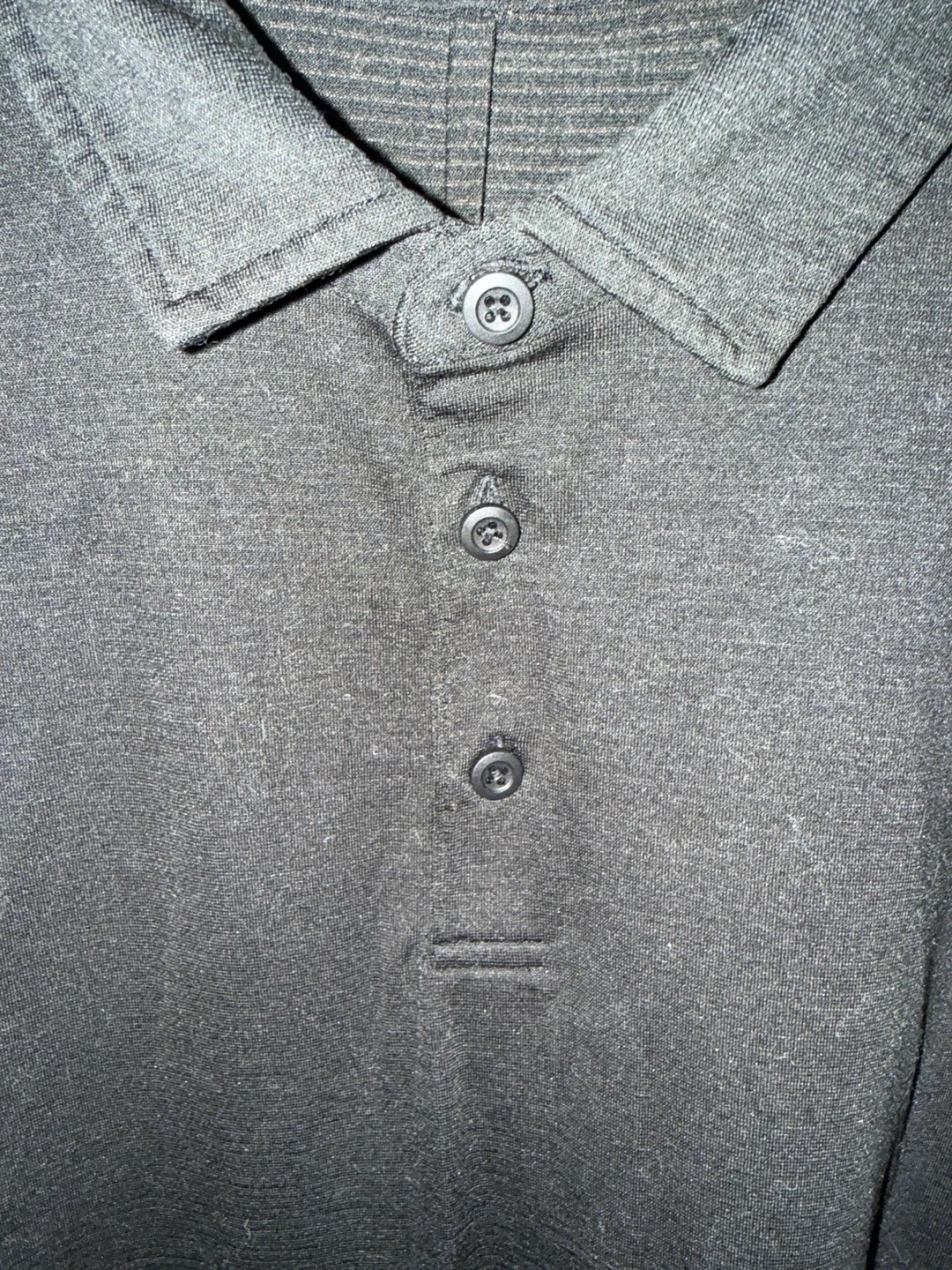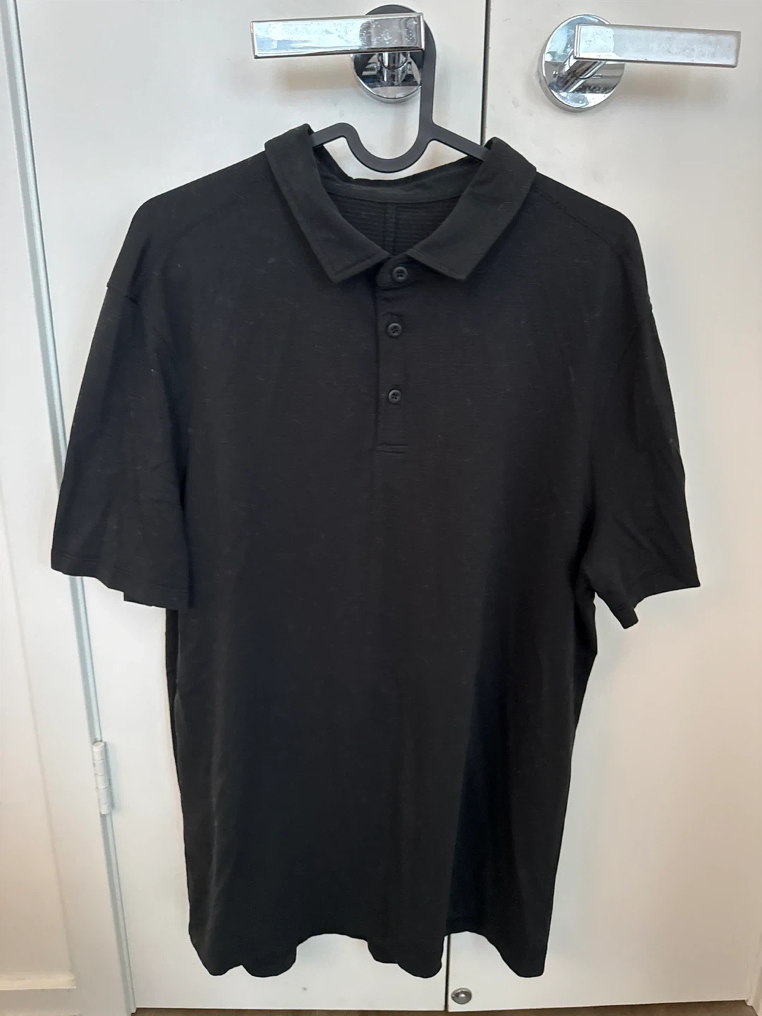 Black Lululemon short-sleeve polo shirt. Three-button placket with a collared neckline. Perfect for casual wear.