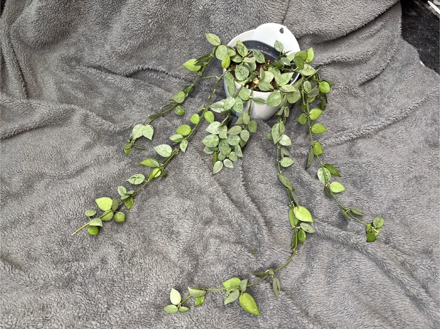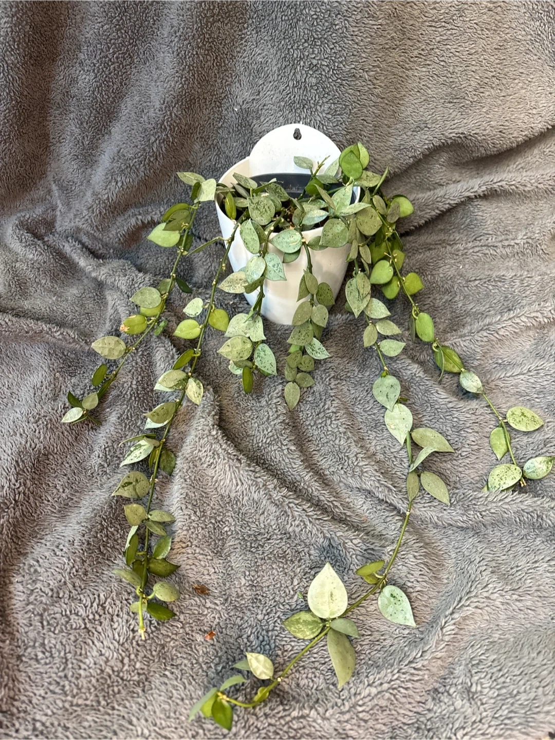 This Hoya Carnosa Compacta features beautiful variegated leaves. It comes in a simple white pot that can be easily hung on any wall or hook . The plant is trailing and would add a unique touch to any space. Hoya “Eskimo or Inuit”.