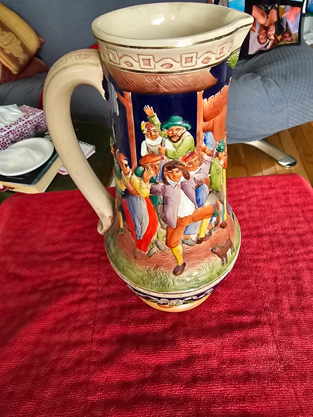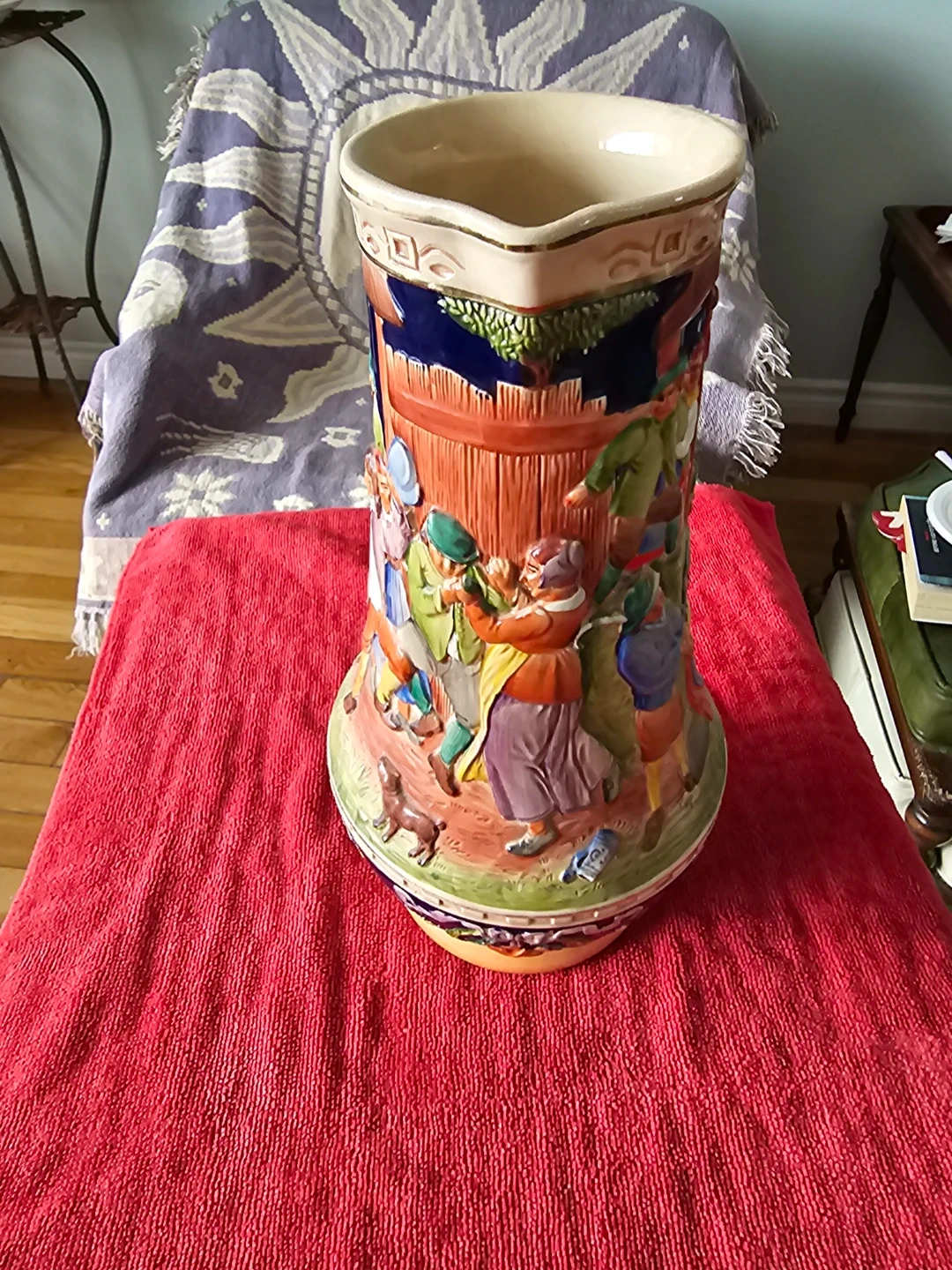 This is a ceramic pitcher featuring a detailed village scene in relief. It has a large handle and a spout for pouring. The design includes various figures and floral elements, with a dark blue background on the upper portion. The base is a light tan colour. It's a decorative piece that would stand out on display.