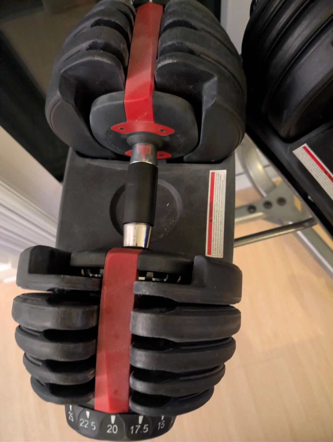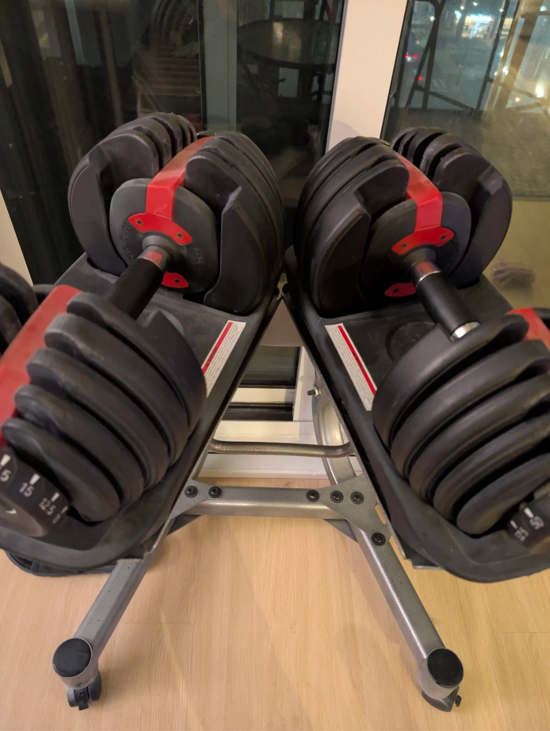 A pair of adjustable dumbbells with weights ranging from 5 to 52.5 lbs each. Dumbbell wrack is included, it's got wheels for easy moving. Worked great as a home alternative until we ended up moving into a building with its own gym :)
