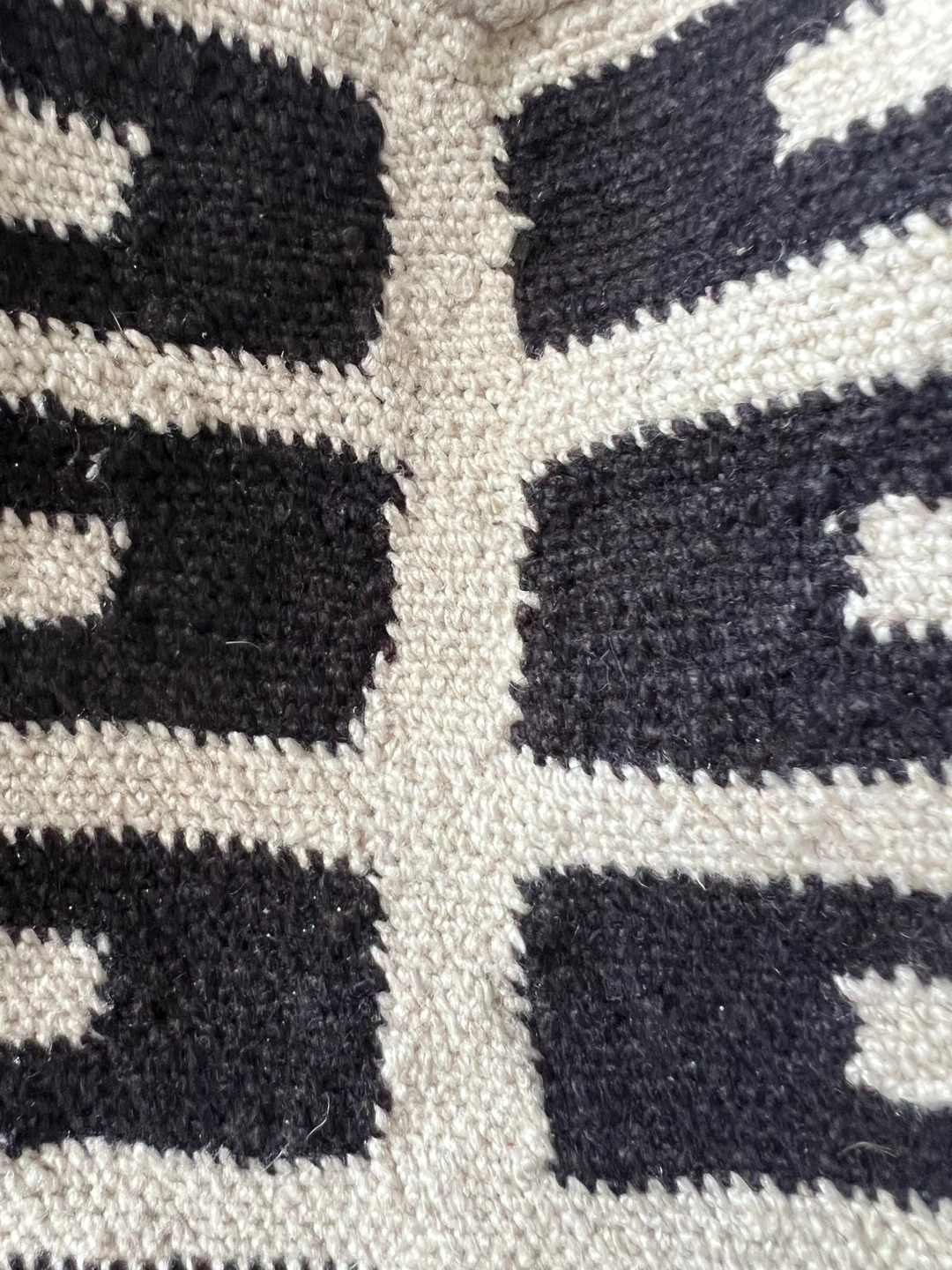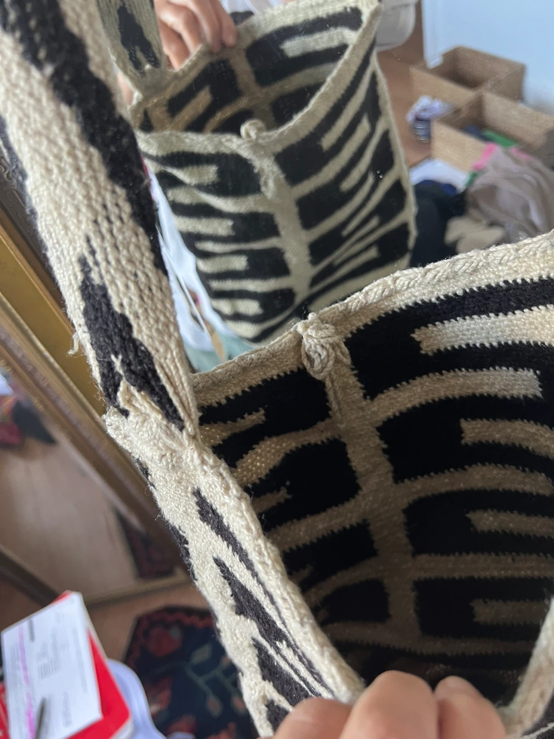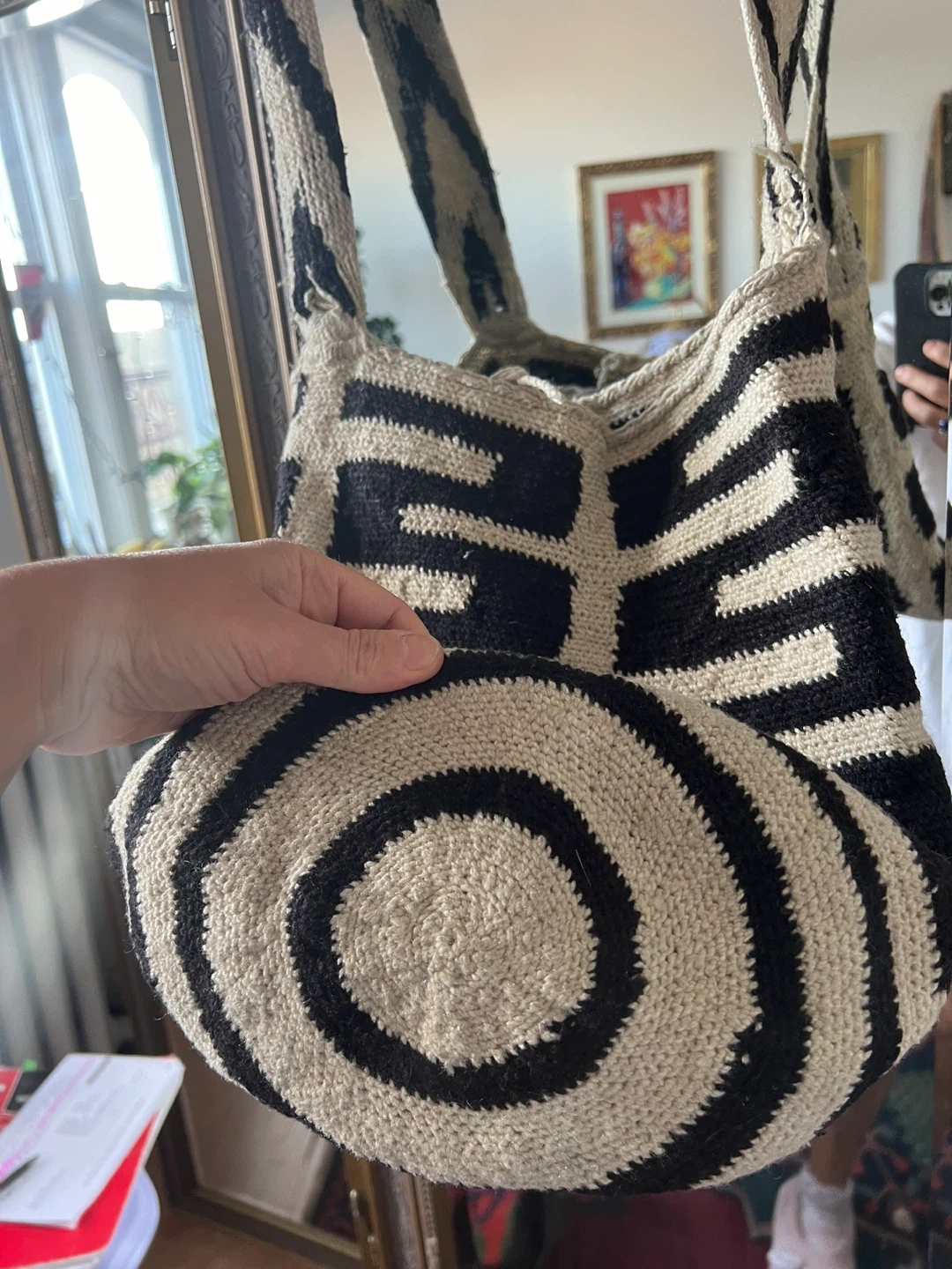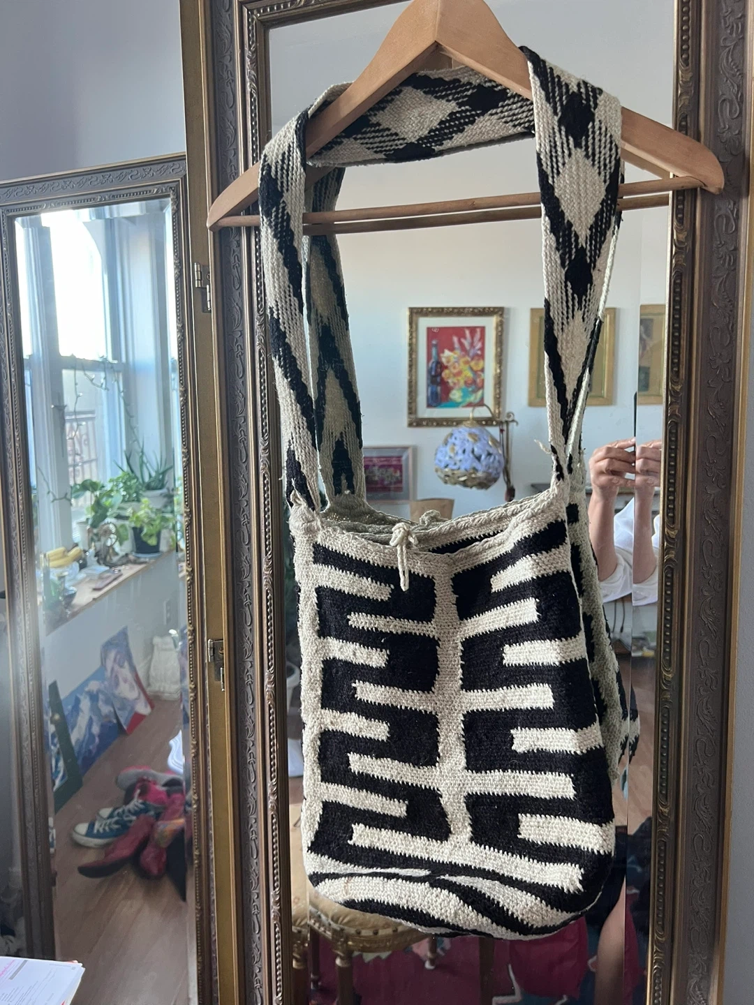 Mocha.Stylish woven shoulder bag with a unique pattern! This bag is handmade, featuring a black and beige design. Perfect for adding a touch of artisanal flair to your look.Handmade in Colombia. Pure Wool.