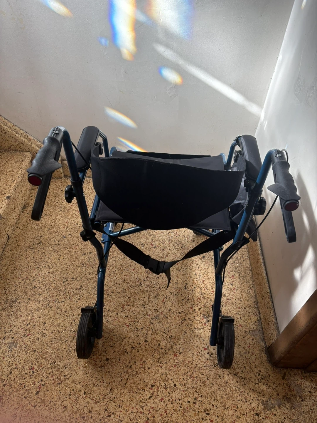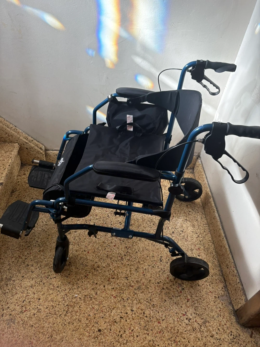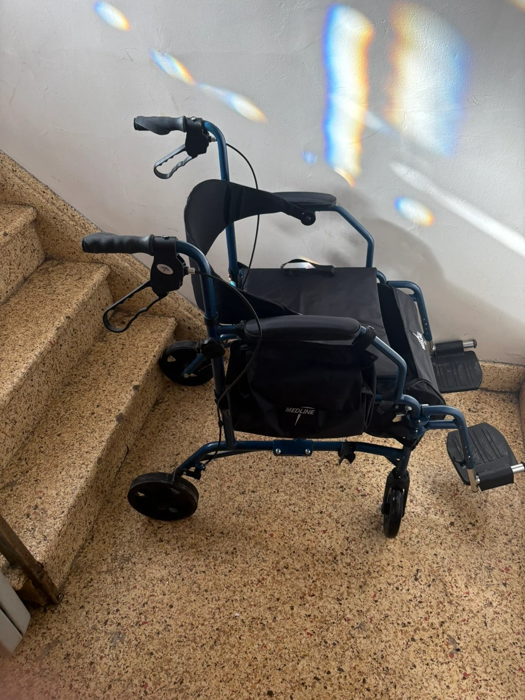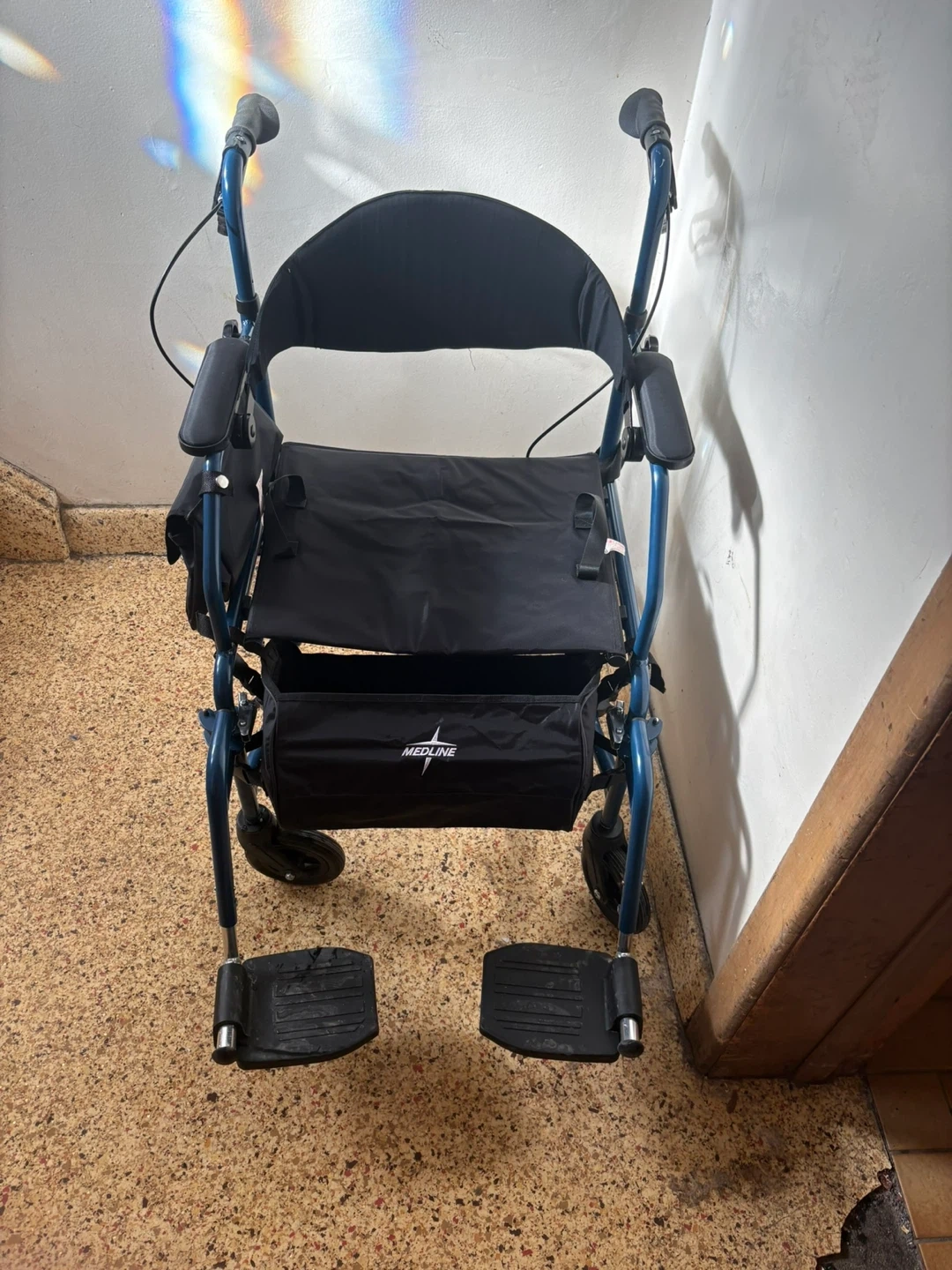 This Medline walker and transport chair is blue. It's a versatile mobility aid with a seat and storage pouch. It features adjustable handles and footrests for comfort. Only used a few times