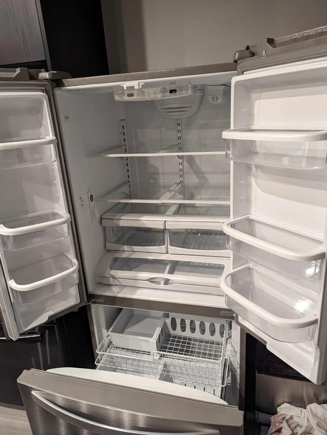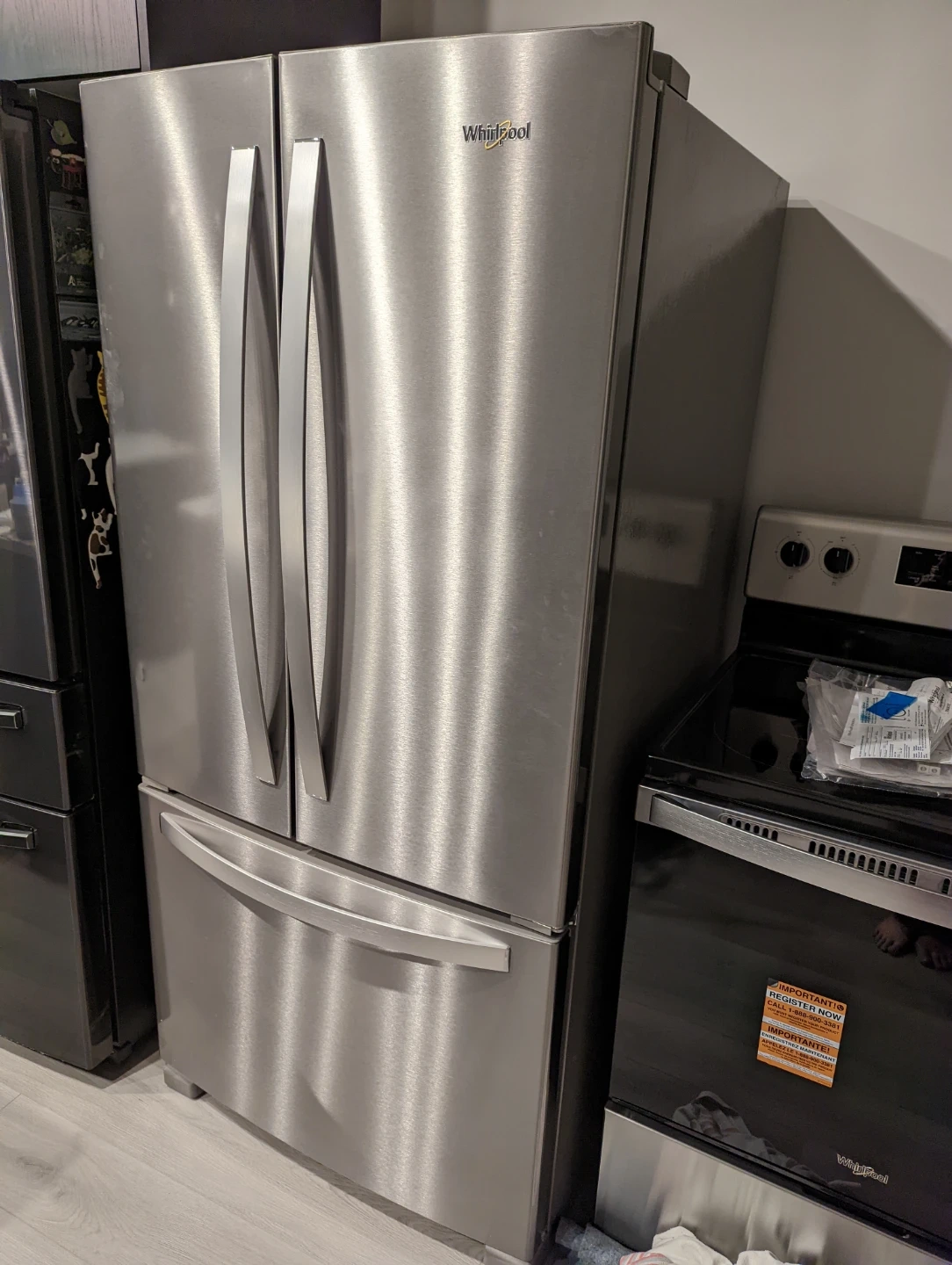 Brand new Whirlpool French door refrigerator with a bottom freezer. It's a stainless steel appliance with plenty of shelf space inside. The fridge comes with adjustable shelving and door bins. Includes warranty.