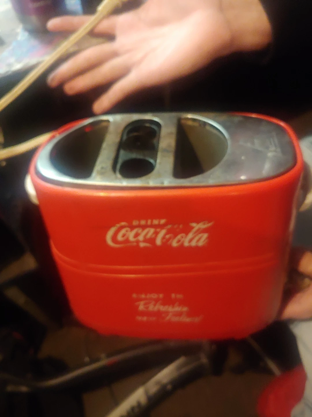 This is a vintage Coca-Cola ashtray. It's red with the classic Coca-Cola logo. Made of durable plastic with a metal top insert. Perfect for a collector or a man cave!