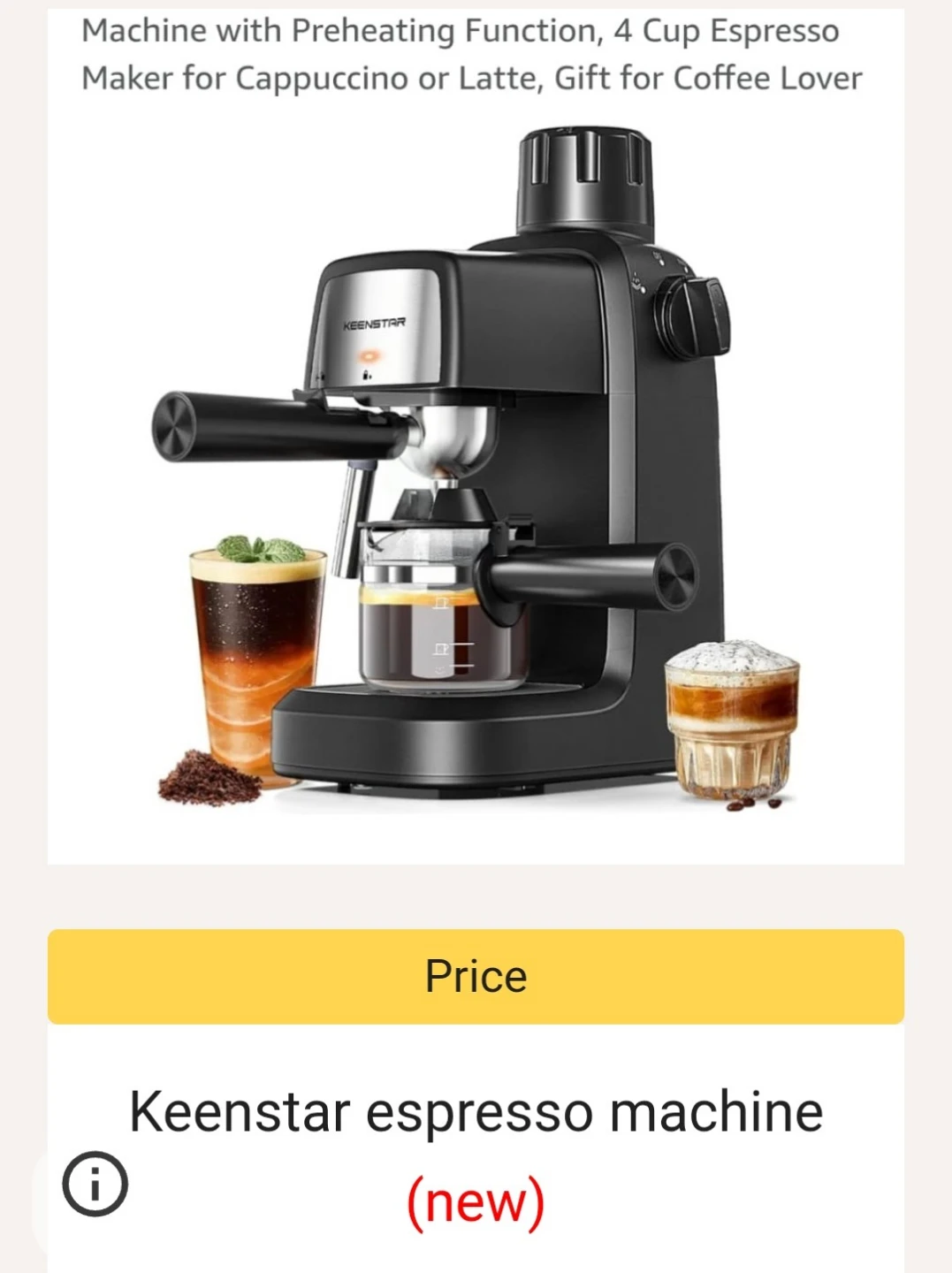 Keenstar espresso machine with preheating function. Makes cappuccino or latte. It's a great gift for coffee lovers!