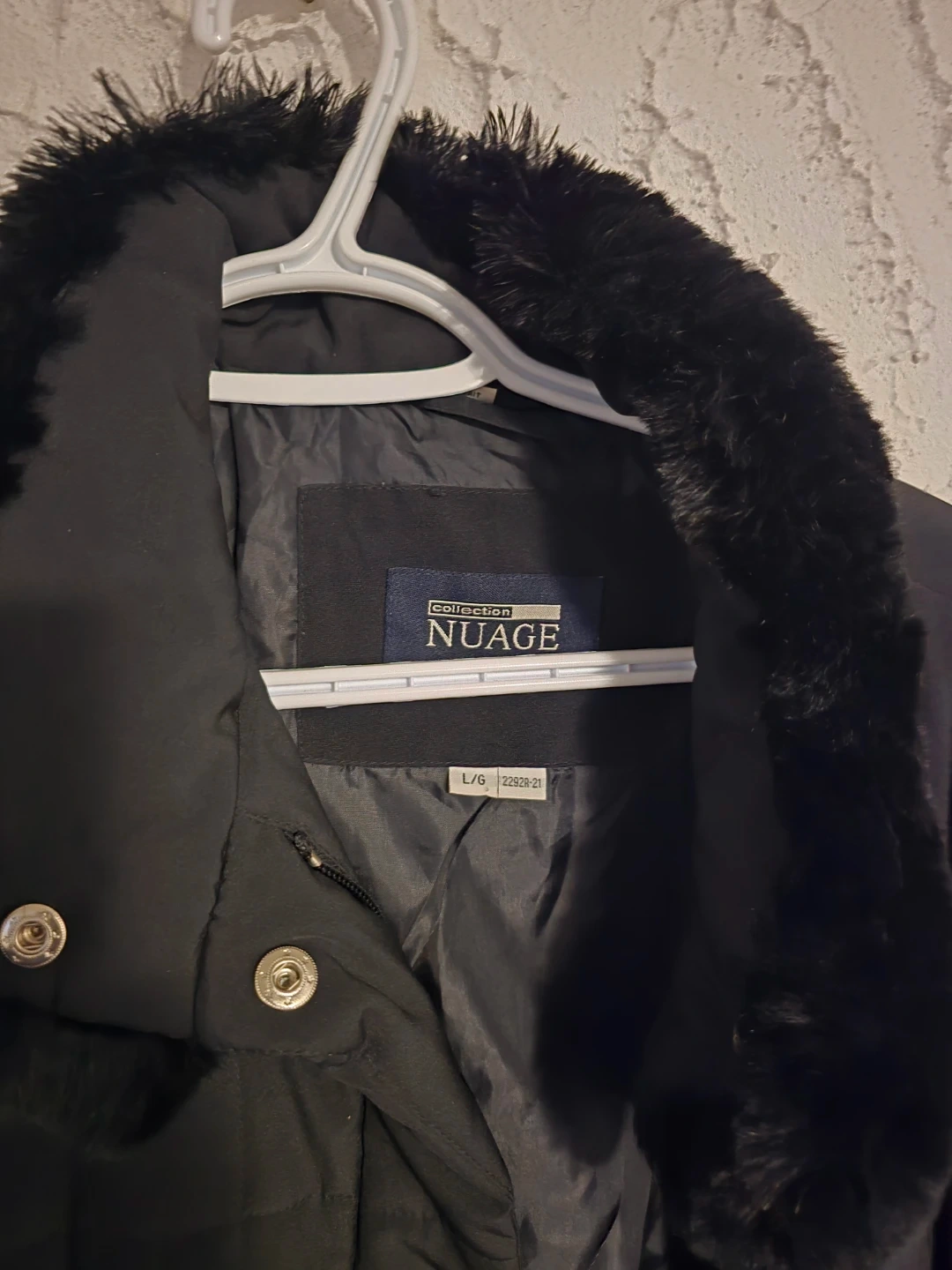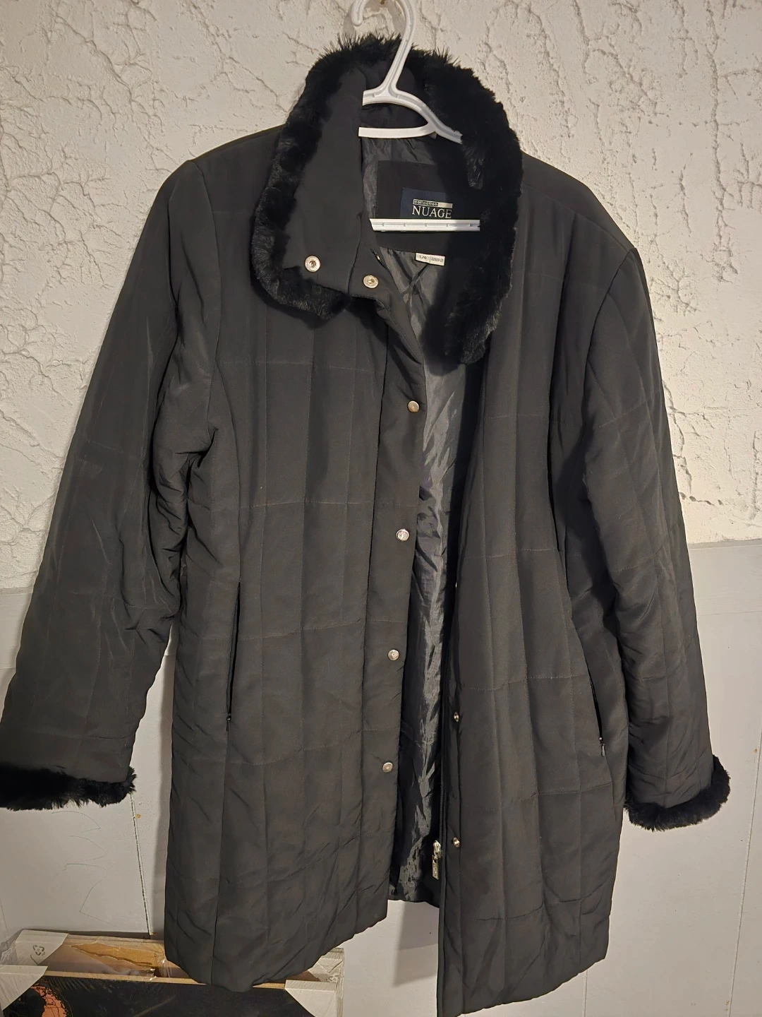 This Nuage quilted jacket is black and features a faux fur trim on the collar and cuffs. It's a size L/G. The quilted pattern adds a nice touch of style and warmth. Spb free home in Transcona.