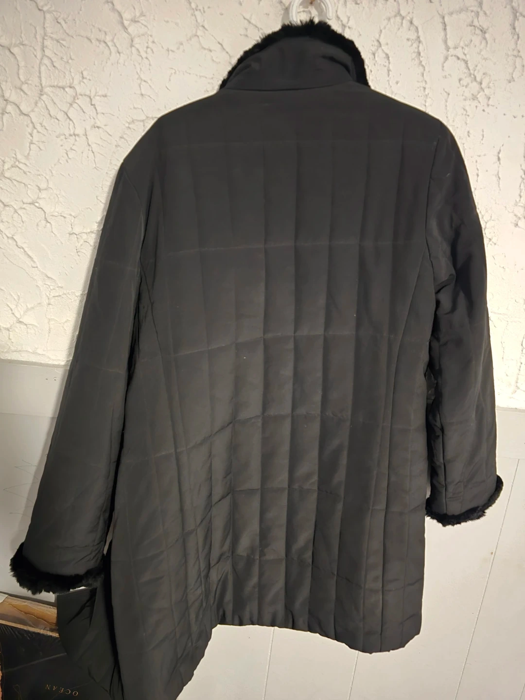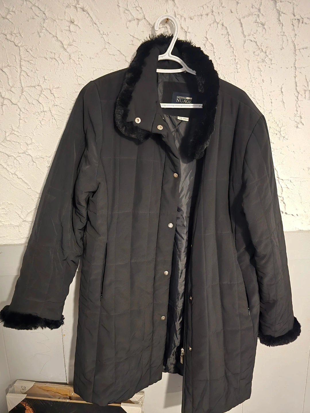This Nuage quilted jacket is black and features a faux fur trim on the collar and cuffs. It's a size L/G. The quilted pattern adds a nice touch of style and warmth. Spb free home in Transcona.